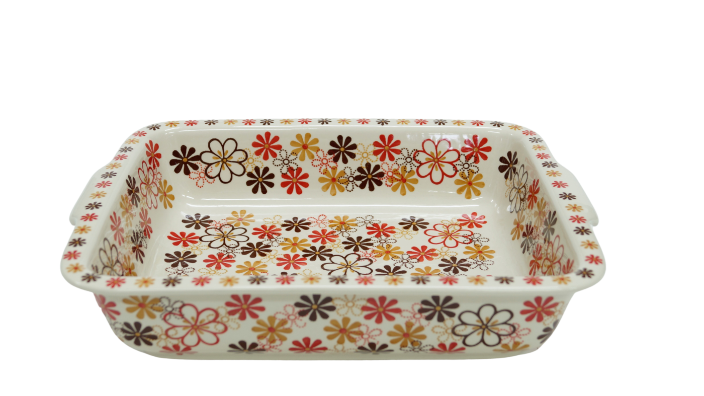 Szkliwione naczynia ceramiczne z Bolesławca to trwałość, jakość i wyjątkowo ślicznie zdobione produkty. Uzupełnij swoją zastawę stołową o piękną formę do zapiekania o prostokątnym kształcie z urokliwą i oryginalną linią brzegową. Rant wysunięty na zewnątrz nadaje uroku i funkcjonalności, naczynie jest łatwe do przenoszenia - tak zwana krawędź-uchwyt, pomocny w użytkowaniu, łatwiej przeniesiesz gorące naczynie prosto z piekarnika.