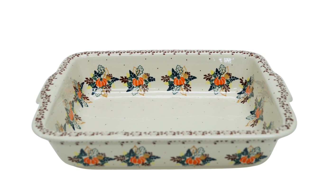 Szkliwione naczynia ceramiczne z Bolesławca to trwałość, jakość i wyjątkowo ślicznie zdobione produkty. Uzupełnij swoją zastawę stołową o piękną formę do zapiekania o prostokątnym kształcie z urokliwą i oryginalną linią brzegową. Rant wysunięty na zewnątrz nadaje uroku i funkcjonalności, naczynie jest łatwe do przenoszenia - tak zwana krawędź-uchwyt, pomocny w użytkowaniu, łatwiej przeniesiesz gorące naczynie prosto z piekarnika.