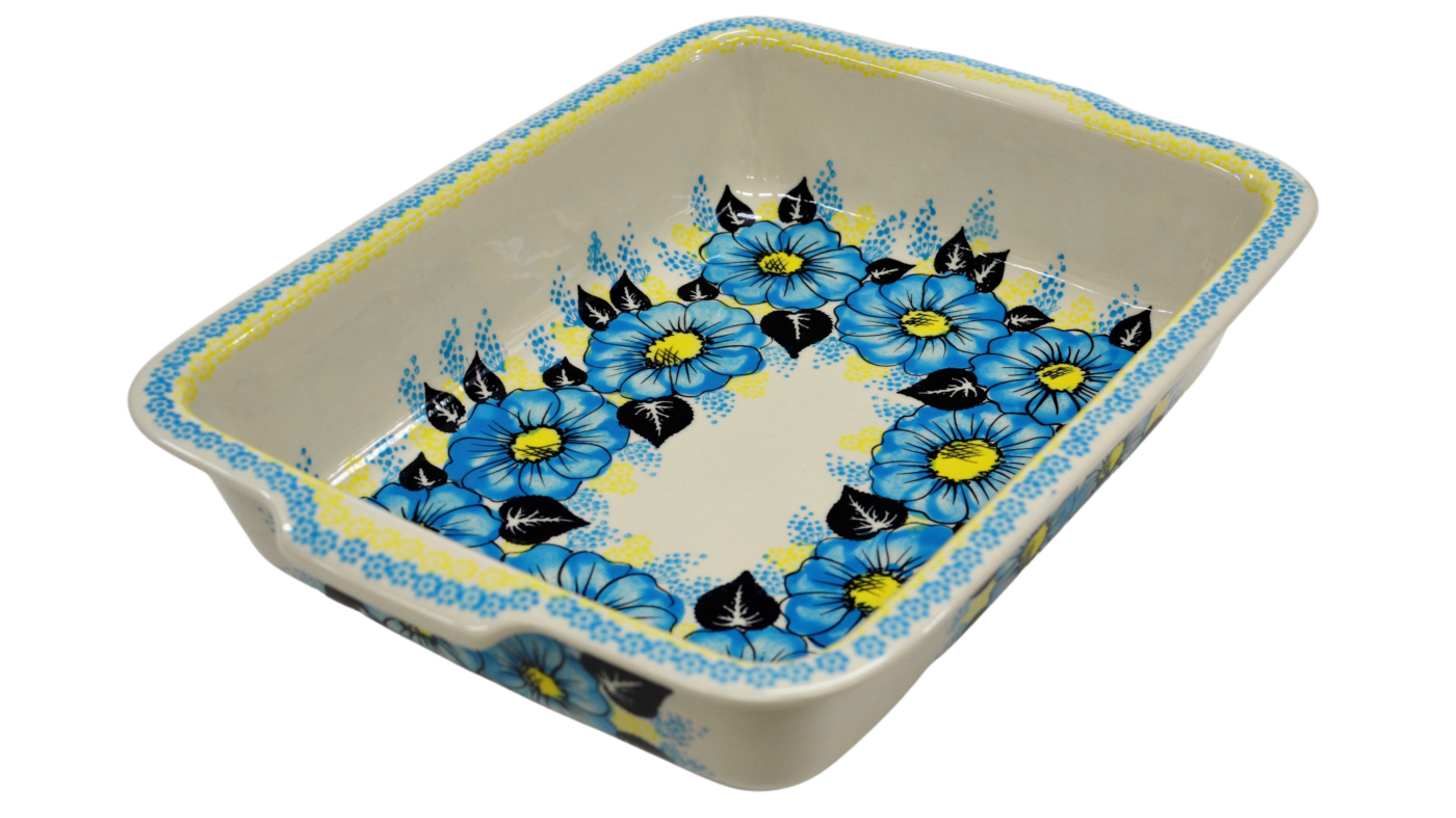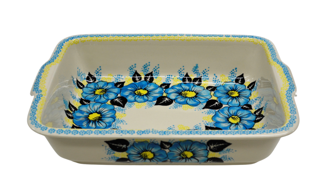 Szkliwione naczynia ceramiczne z Bolesławca to trwałość, jakość i wyjątkowo ślicznie zdobione produkty. Uzupełnij swoją zastawę stołową o piękną formę do zapiekania o prostokątnym kształcie z urokliwą i oryginalną linią brzegową. Rant wysunięty na zewnątrz nadaje uroku i funkcjonalności, naczynie jest łatwe do przenoszenia - tak zwana krawędź-uchwyt, pomocny w użytkowaniu, łatwiej przeniesiesz gorące naczynie prosto z piekarnika.