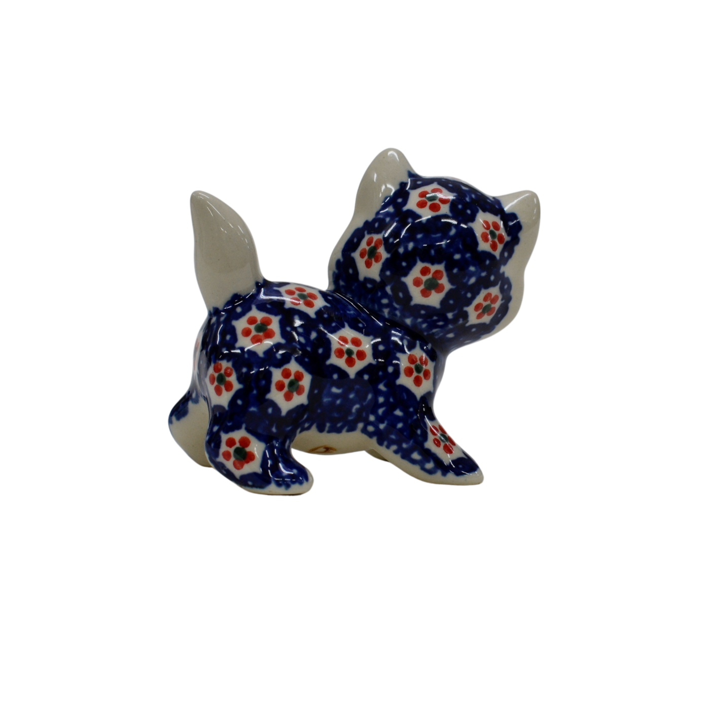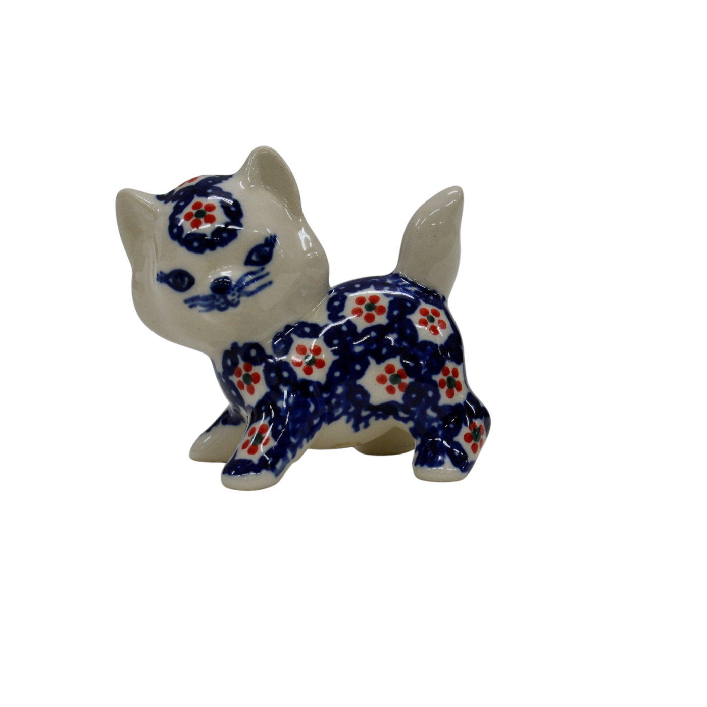 Kotki wykonane z oryginalnej kamionkowej ceramiki, pokryte błyszczącym szkliwem transparentnym okrywającym barwne dekoracje kwiatowe i stempelkowe.