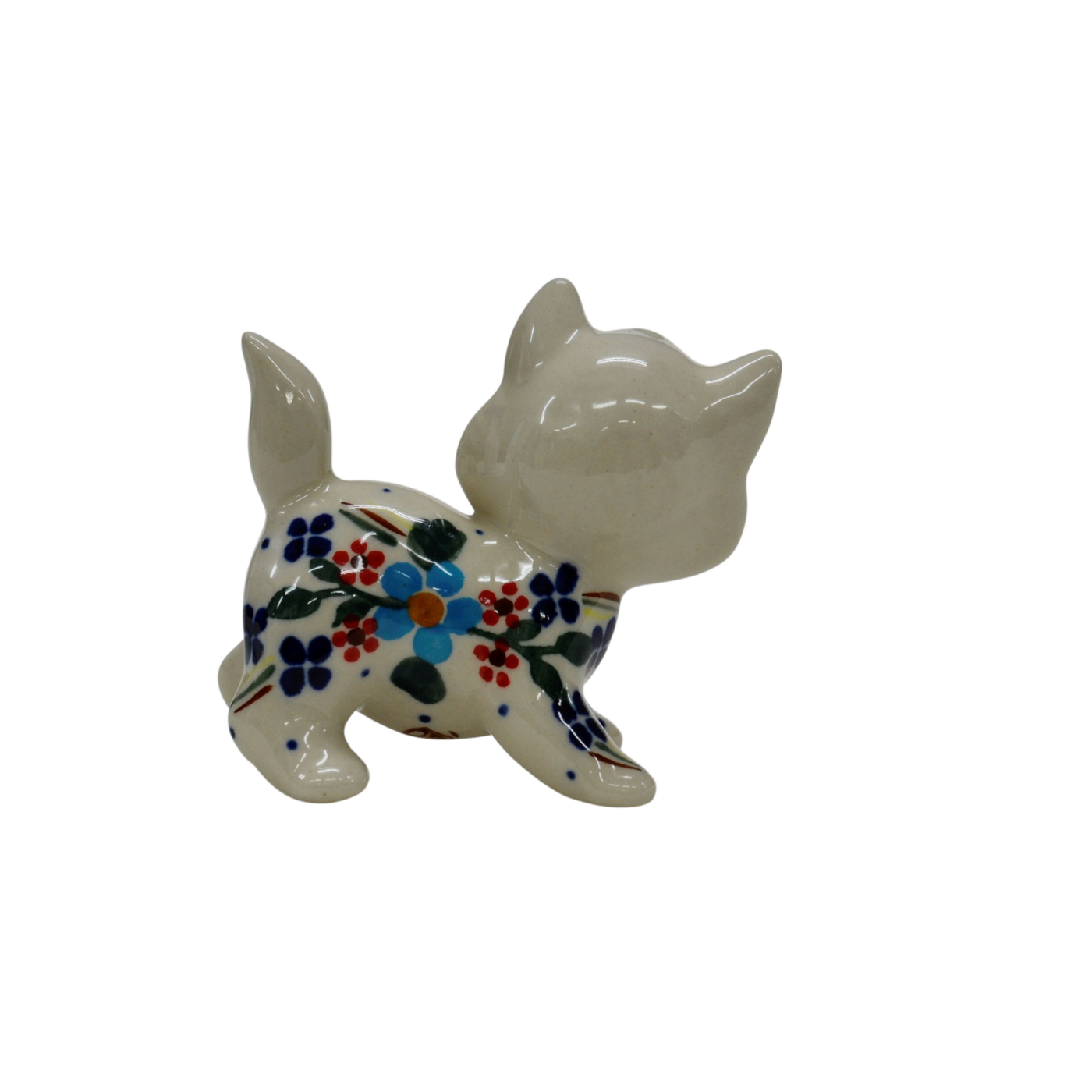 Kotki wykonane z oryginalnej kamionkowej ceramiki, pokryte błyszczącym szkliwem transparentnym okrywającym barwne dekoracje kwiatowe i stempelkowe.