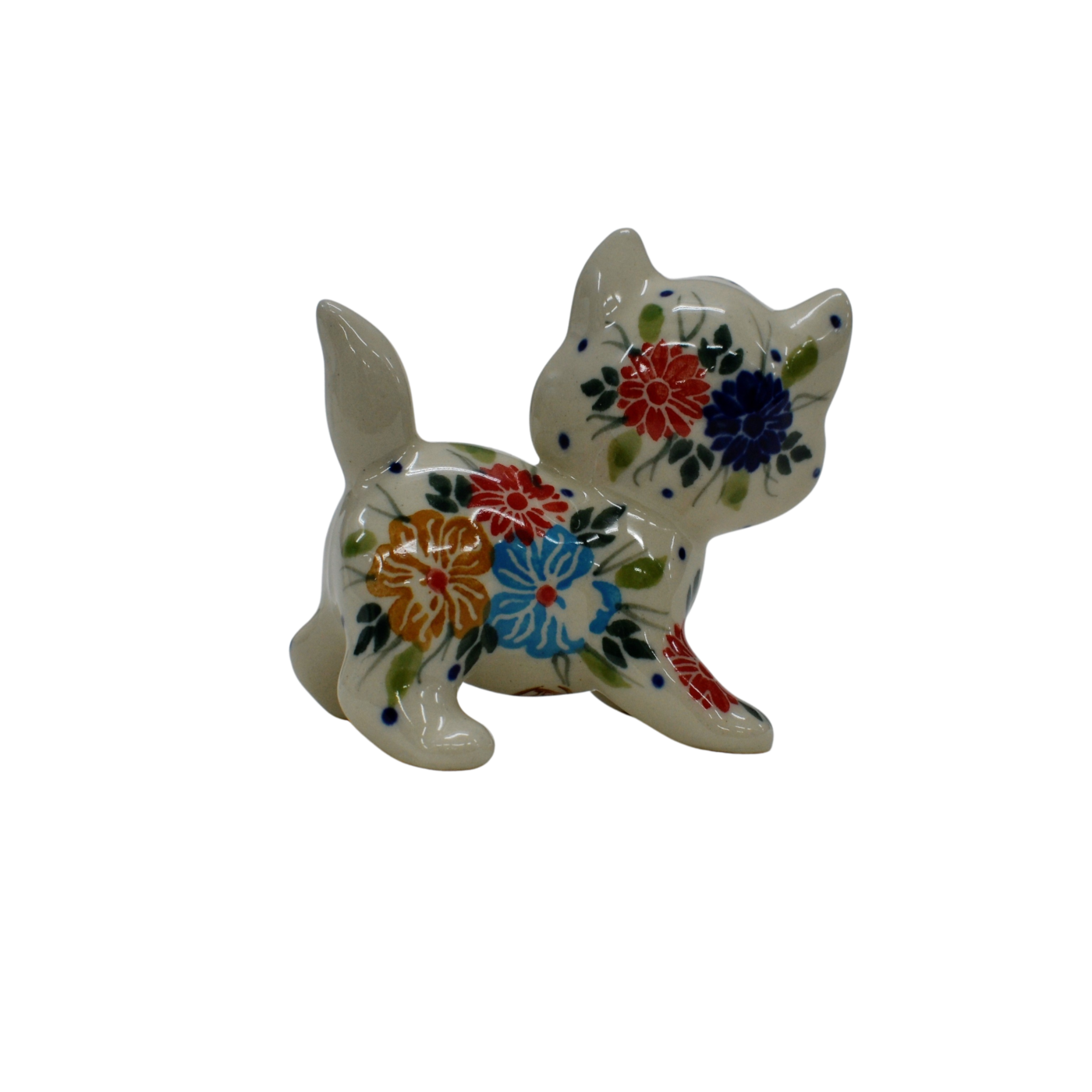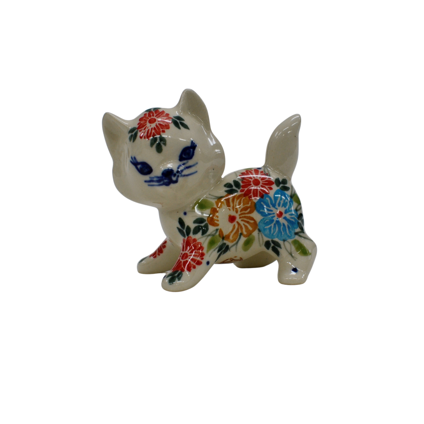 Kotki wykonane z oryginalnej kamionkowej ceramiki, pokryte błyszczącym szkliwem transparentnym okrywającym barwne dekoracje kwiatowe i stempelkowe.