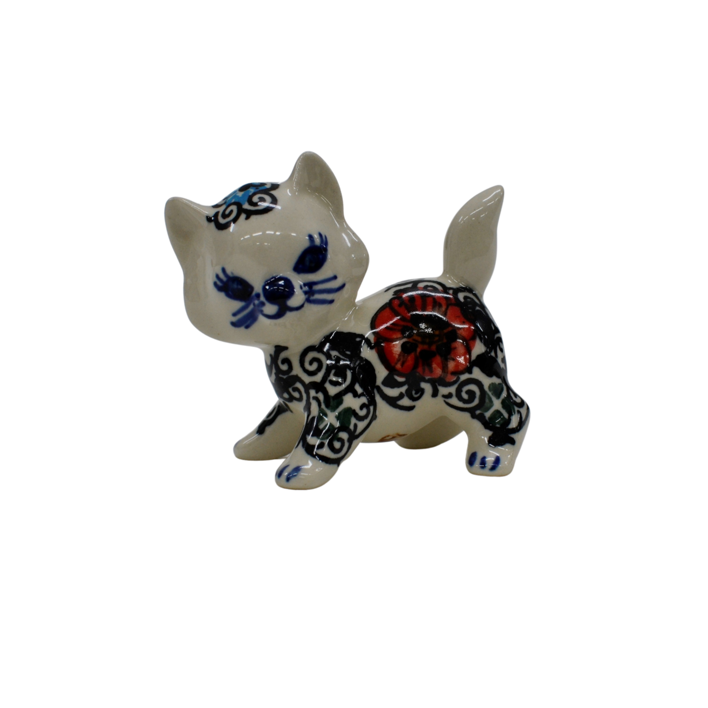 Kotki wykonane z oryginalnej kamionkowej ceramiki, pokryte błyszczącym szkliwem transparentnym okrywającym barwne dekoracje kwiatowe i stempelkowe.
