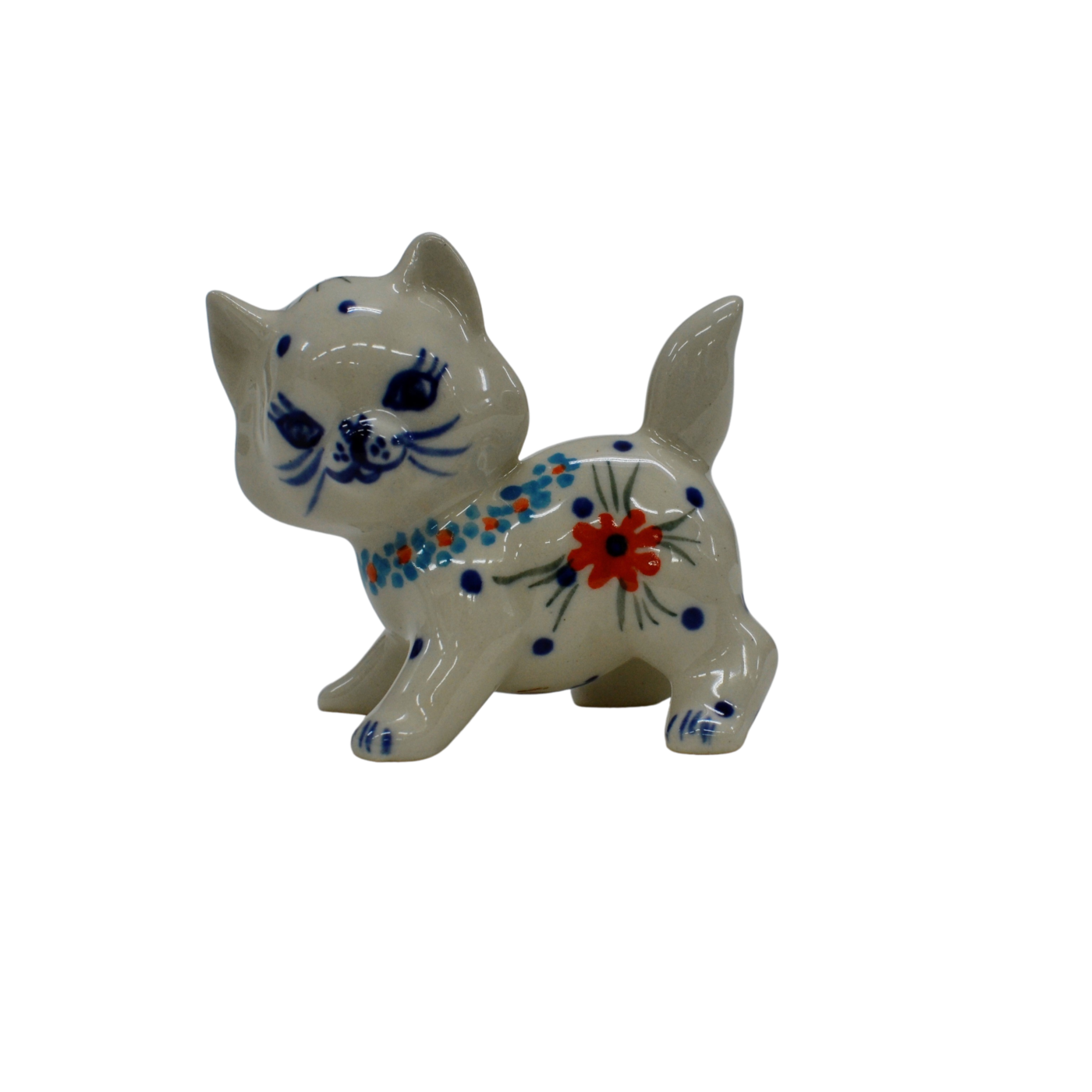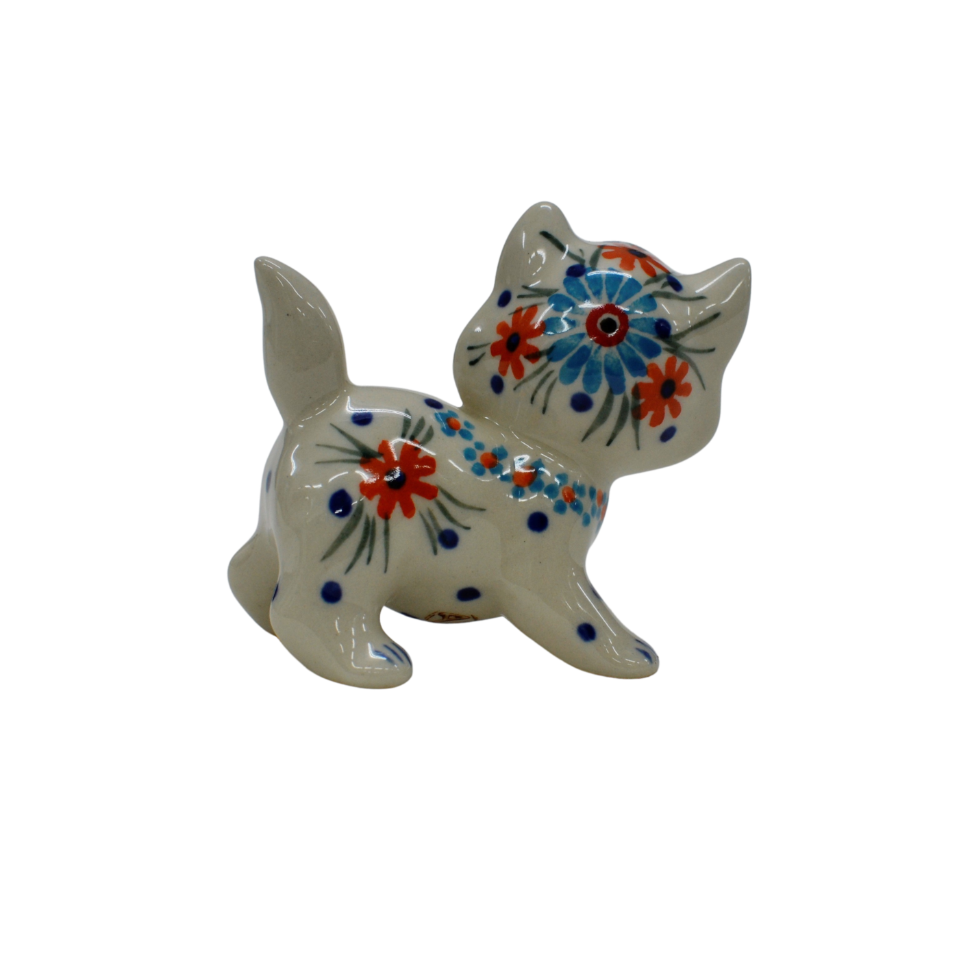 Kotki wykonane z oryginalnej kamionkowej ceramiki, pokryte błyszczącym szkliwem transparentnym okrywającym barwne dekoracje kwiatowe i stempelkowe.