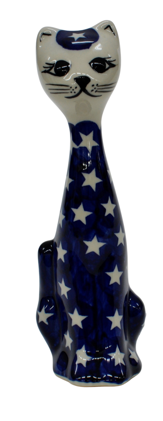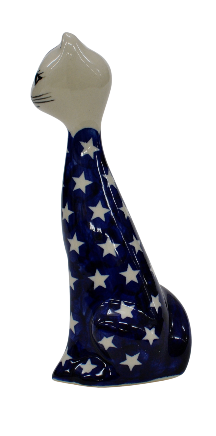 Oryginalny produkt ceramiki bolesławieckiej z zakładu ceramiki artystycznej, kot Bolek niski, ceramiczna figurka dekoracyjna.