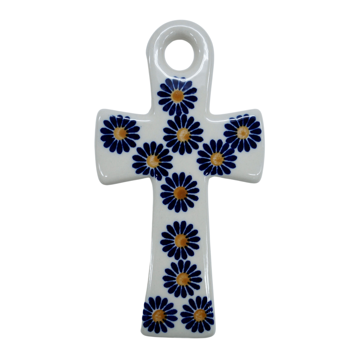 Krzyż na ścianę z możliwością zawieszenia, dzięki otworowi w górnej części krzyża. Stanowi idealny dodatek również do świątecznych stroików na stół czy jako element dekoracji ściennej domu. Krzyże ceramiczne to ozdoby i symbole religijne, ręcznie malowanie w tradycyjne i unikatowe wzory ceramiki artystycznej.