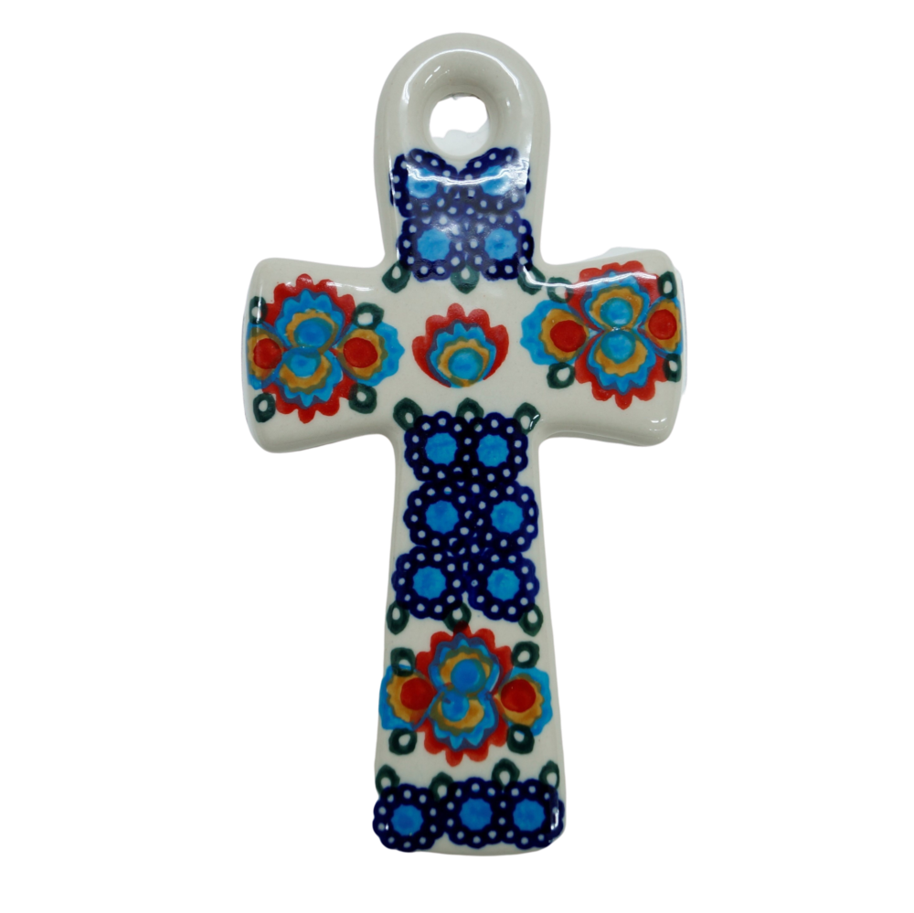 Krzyż na ścianę z możliwością zawieszenia, dzięki otworowi w górnej części krzyża. Stanowi idealny dodatek również do świątecznych stroików na stół czy jako element dekoracji ściennej domu. Krzyże ceramiczne to ozdoby i symbole religijne, ręcznie malowanie w tradycyjne i unikatowe wzory ceramiki artystycznej.