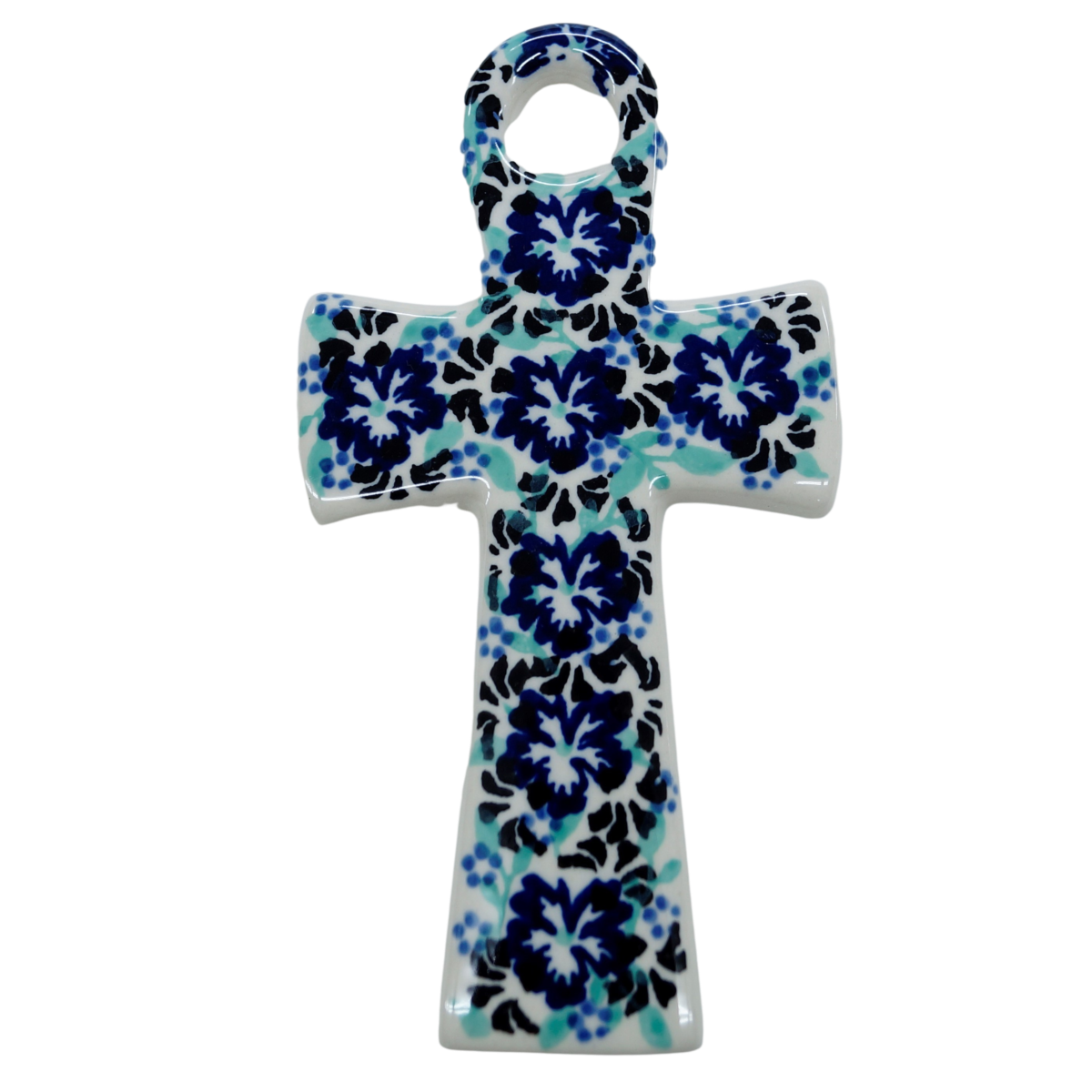 Krzyż na ścianę z możliwością zawieszenia, dzięki otworowi w górnej części krzyża. Stanowi idealny dodatek również do świątecznych stroików na stół czy jako element dekoracji ściennej domu. Krzyże ceramiczne to ozdoby i symbole religijne, ręcznie malowanie w tradycyjne i unikatowe wzory ceramiki artystycznej.