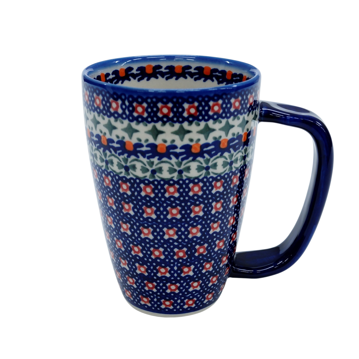 Tworząc kubki ceramiczne trzeba pamiętać jak skomplikowanym są produktem i jak ciężko jest trafić w gusta klientów. Nam się udało! Kubek Capuccino z uchem to brat kubka w tej samej wersji z łyżką, natomiast ten jest pozbawiony łyżki gdyż nie każdy z nas słodzi kawę bądź eksperymentuje z dodatkami do niej. Kubek jest duży, wysoki i bardzo ładnie leży w ręce, nawet męskiej, solidnie zbudowanej. Owalny kształt ucha dobrze komponuje się z dekoracjami wyrobów kamionki bolesławieckiej marki, ANDY CERAMIKA. Dużo barw i zdecydowane nasycenie kolorów pozwala wyróżniać nasze produkty spośród innych wyrobów ceramicznych nie powstałych w naszej rodzinnej manufakturze. Oryginalne style zdobienia, charakterystyczne tylko spod ręki naszych artystów, dodadzą efektywności Twojej kolekcji wyrobów ceramiki.