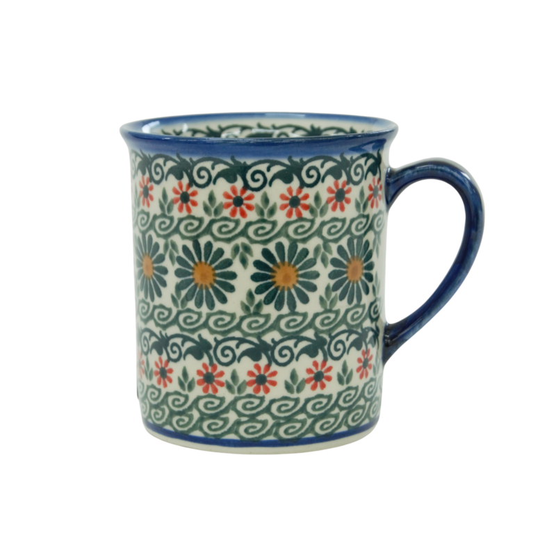 Kubek MARS, klasyczny wzór kubka o pionowym brzegu z lekko wywiniętym rantem na zewnątrz doskonale leżącym przy ustach. To typowy kubek ceramiki bolesławieckiej, charakterystyczny kształt doskonale wkomponowujący się w każdą zastawę ceramiki. Według nas jego popularność wynika z idealnego rozmiaru i prostego kształtu. Nadaje się do zaparzania herbat, kawy, podawania soków i komputów. Można łatwo przywiesić za ucho kubka woreczek z herbatą, tak by nie zatopił się sznureczek z etykietą herbaty. Zdobione w unikatowe wzory, wykonane ze szczególną dbałością o detale to charakterystyczna cecha ceramiki zwanej porcelaną z Bolesławca.