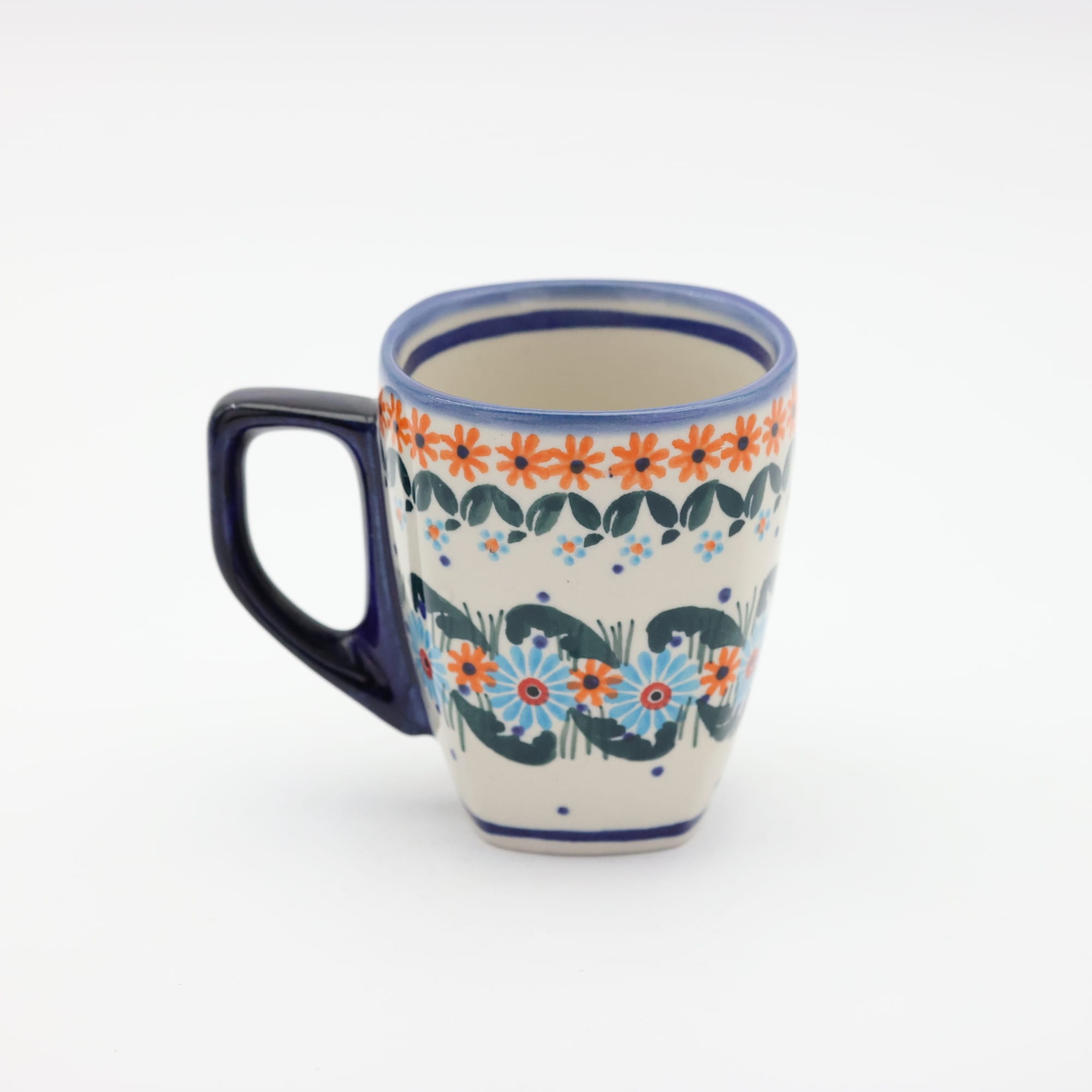 Kubek bolesławiecki kwadratowy o nowoczesnej bryle. Kształt kubka o kwadratowym brzegu.