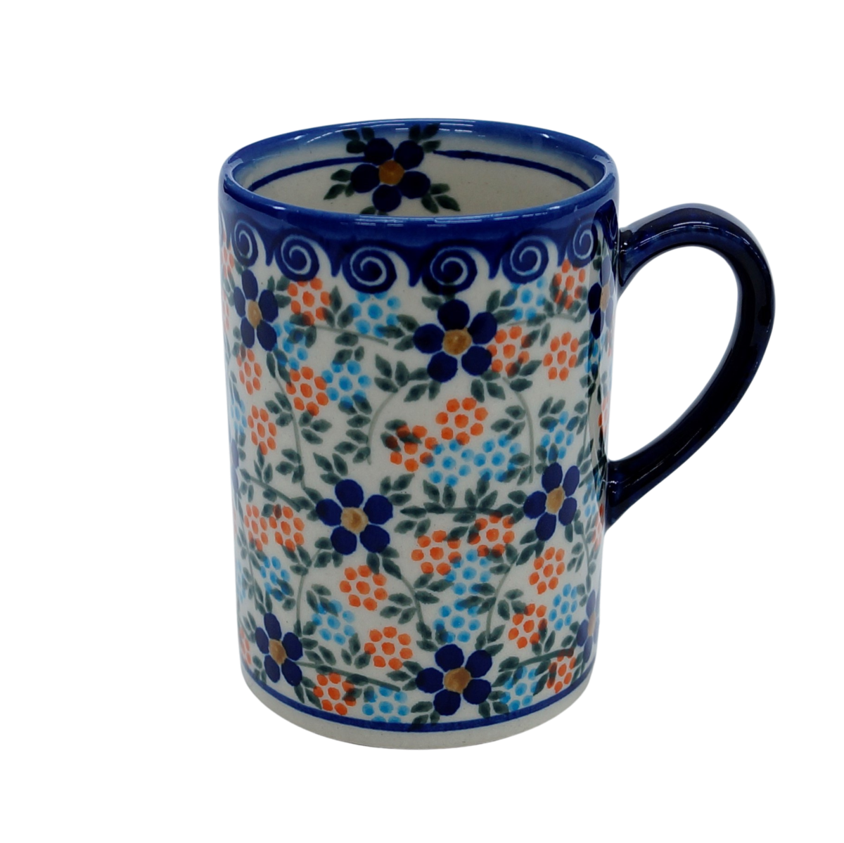 Kubek ceramiczny prosty pojemności 250 ml z uchem ułatwiającym przenoszenie i spożywanie kawy lub herbaty. To typowy kubek ceramiki bolesławieckiej, charakterystyczny kształt doskonale wkomponowujący się w każdą zastawę ceramiki stołowej. Według nas jego popularność wynika z idealnego rozmiaru i prostego kształtu. Nadaje się do zaparzania herbat, kawy, podawania soków i komputów. Można łatwo przywiesić za ucho kubka woreczek z herbatą, tak by nie zatopił się sznureczek z etykietą herbaty. Zdobione w unikatowe, ręcznie malowane bolesławieckie wzory, wykonane ze szczególną dbałością o detale to charakterystyczna cecha ceramiki zwanej porcelaną z Bolesławca.
