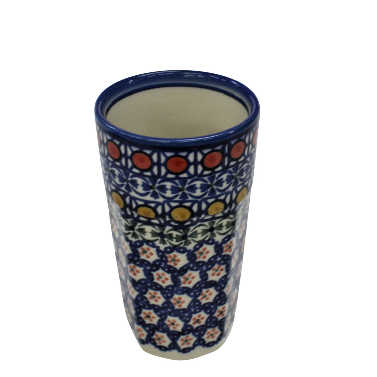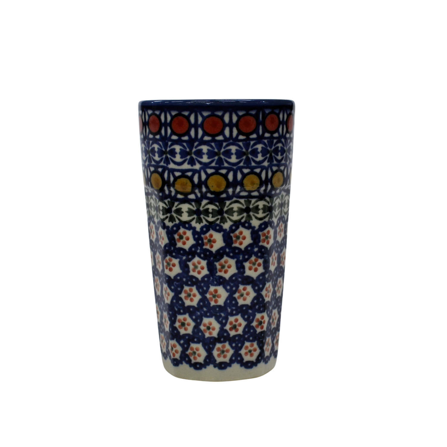 Oryginalny kubek z Bolesławca, ręcznie malowany o nowoczesnym, kanciastym kształcie. Pojemność kubka to 300 ml, jest wysoki i idealnie nadanie się do podawania herbaty bądź różnorakich kaw. Nam najbardziej służy do podawania słodkich kisielów i budyniu ale gorące kakao z pewnością również będzie smakowało wyśmienicie. Gorąca czekolada z bitą śmietaną podana w tym kubku, podczas przygotowywania zdjęć do oferty internetowej pochłonięta została przez fotografa błyskawicznie, mniam... palce lizać, uwielbiamy słodkie napoje!