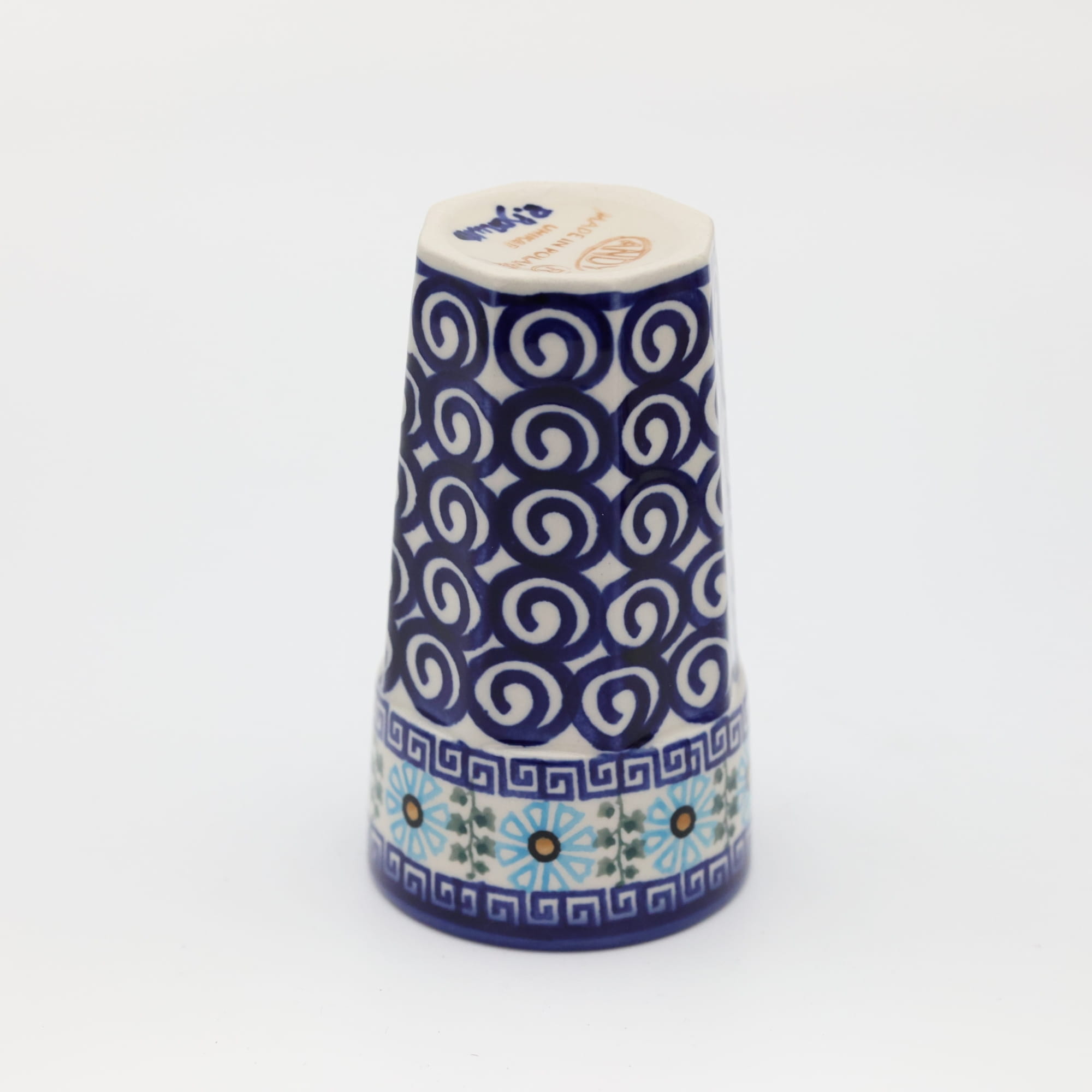 Oryginalny kubek z Bolesławca, ręcznie malowany o nowoczesnym, kanciastym kształcie. Pojemność kubka to 300 ml, jest wysoki i idealnie nadanie się do podawania herbaty bądź różnorakich kaw. Nam najbardziej służy do podawania słodkich kisielów i budyniu ale gorące kakao z pewnością również będzie smakowało wyśmienicie. Gorąca czekolada z bitą śmietaną podana w tym kubku, podczas przygotowywania zdjęć do oferty internetowej pochłonięta została przez fotografa błyskawicznie, mniam... palce lizać, uwielbiamy słodkie napoje!