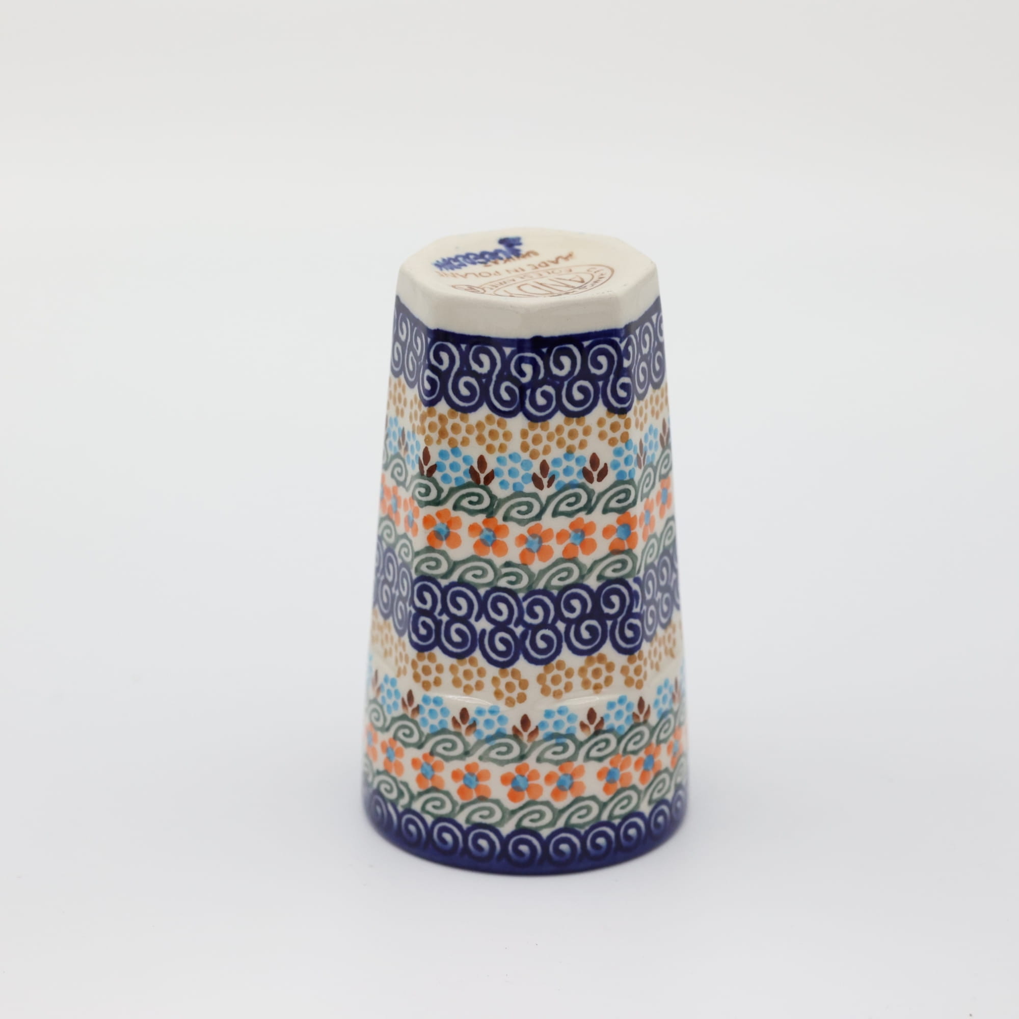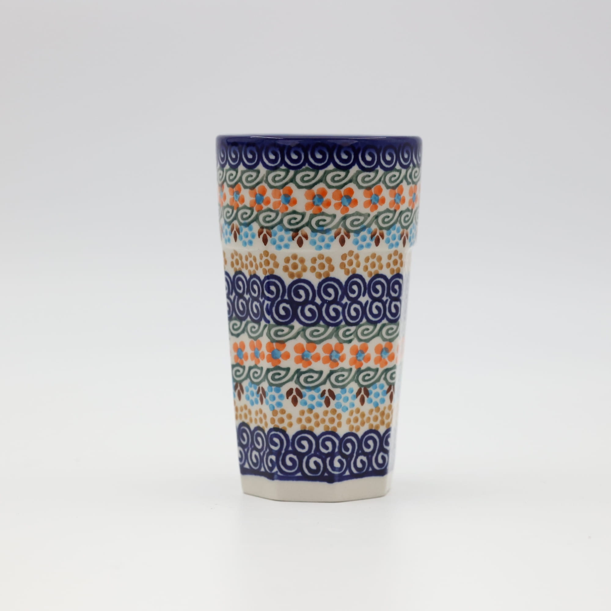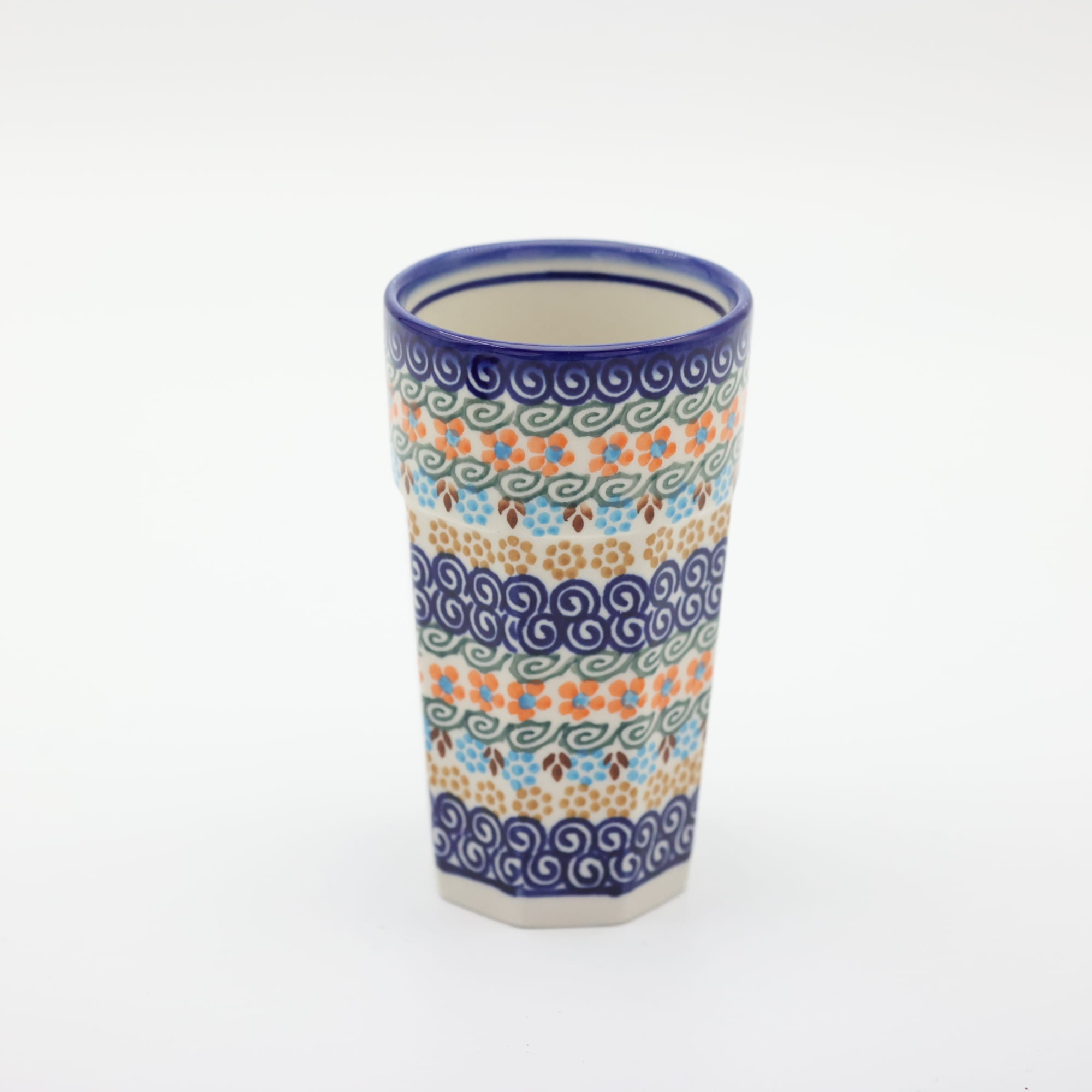 Oryginalny kubek z Bolesławca, ręcznie malowany o nowoczesnym, kanciastym kształcie. Pojemność kubka to 300 ml, jest wysoki i idealnie nadanie się do podawania herbaty bądź różnorakich kaw. Nam najbardziej służy do podawania słodkich kisielów i budyniu ale gorące kakao z pewnością również będzie smakowało wyśmienicie. Gorąca czekolada z bitą śmietaną podana w tym kubku, podczas przygotowywania zdjęć do oferty internetowej pochłonięta została przez fotografa błyskawicznie, mniam... palce lizać, uwielbiamy słodkie napoje!