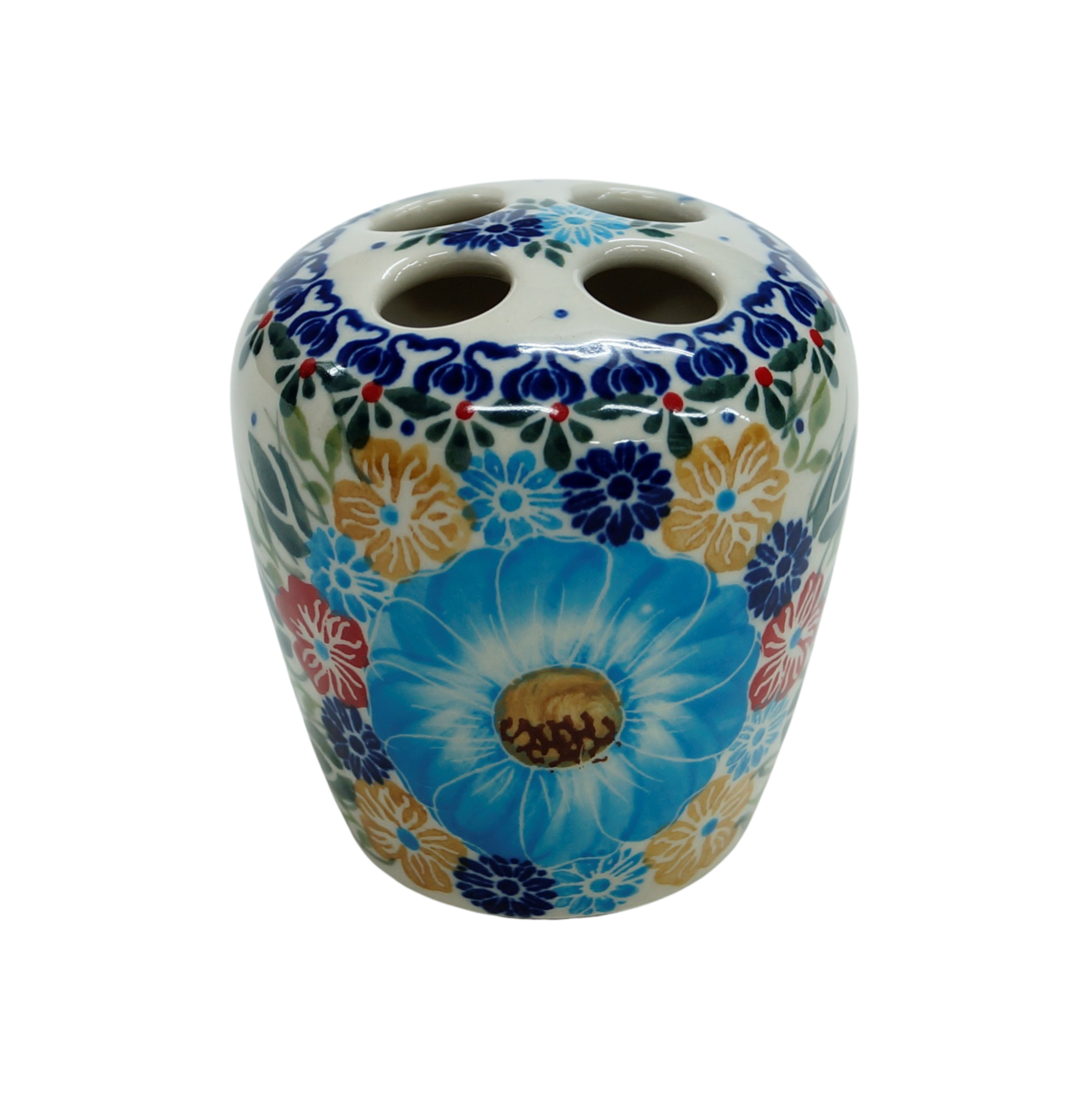 Przedstawiamy prawdziwy hit wśród wyrobów ceramicznych, topowy produkt ceramiki bolesławieckiej do dekoracji łazienek - kubek na szczoteczki do zębów okrągły (z czteroma otworami na szczoteczki do zębów). Wykonany z najwyższej jakości ceramiki, ręcznie malowanej w Bolesławcu.