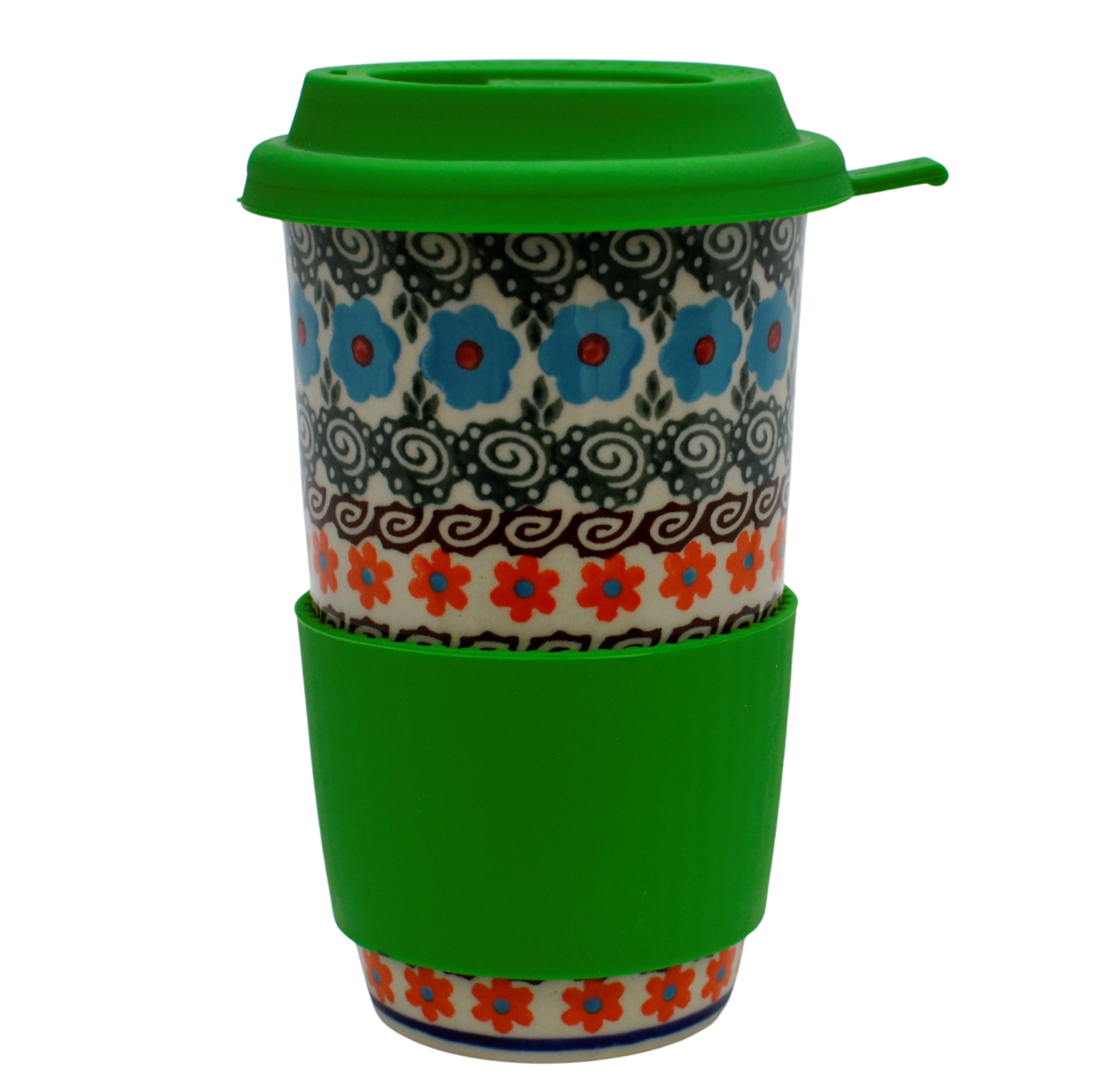Kubek podróżny z pokrywką i nakładką silikonową do przewożenia gorącej kawy lub herbaty w trakcie podróży autem, spaceru z wózkiem bądź innych aktywności fizycznych. Idealne rozwiązanie dla osób uwielbiających kawę w kubku, który dłużej utrzyma jej ciepło. Dobrze dopasowana pokrywka uniemożliwia wylewanie się napojów i zabezpiecza przed nie kontrolowanym oparzeniem się. Różne kolory pokrywek dopasują się do przeróżnie podszkliwnie zdobionej ceramiki bolesławieckiej w motywy kwiatowe, natury i stempelkowe.