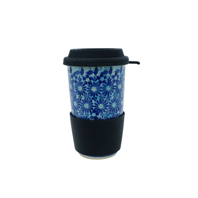 Kubek podróżny z pokrywką i nakładką silikonową do przewożenia gorącej kawy lub herbaty w trakcie podróży autem, spaceru z wózkiem bądź innych aktywności fizycznych. Idealne rozwiązanie dla osób uwielbiających kawę w kubku, który dłużej utrzyma jej ciepło. Dobrze dopasowana pokrywka uniemożliwia wylewanie się napojów i zabezpiecza przed nie kontrolowanym oparzeniem się. Różne kolory pokrywek dopasują się do przeróżnie podszkliwnie zdobionej ceramiki bolesławieckiej w motywy kwiatowe, natury i stempelkowe.