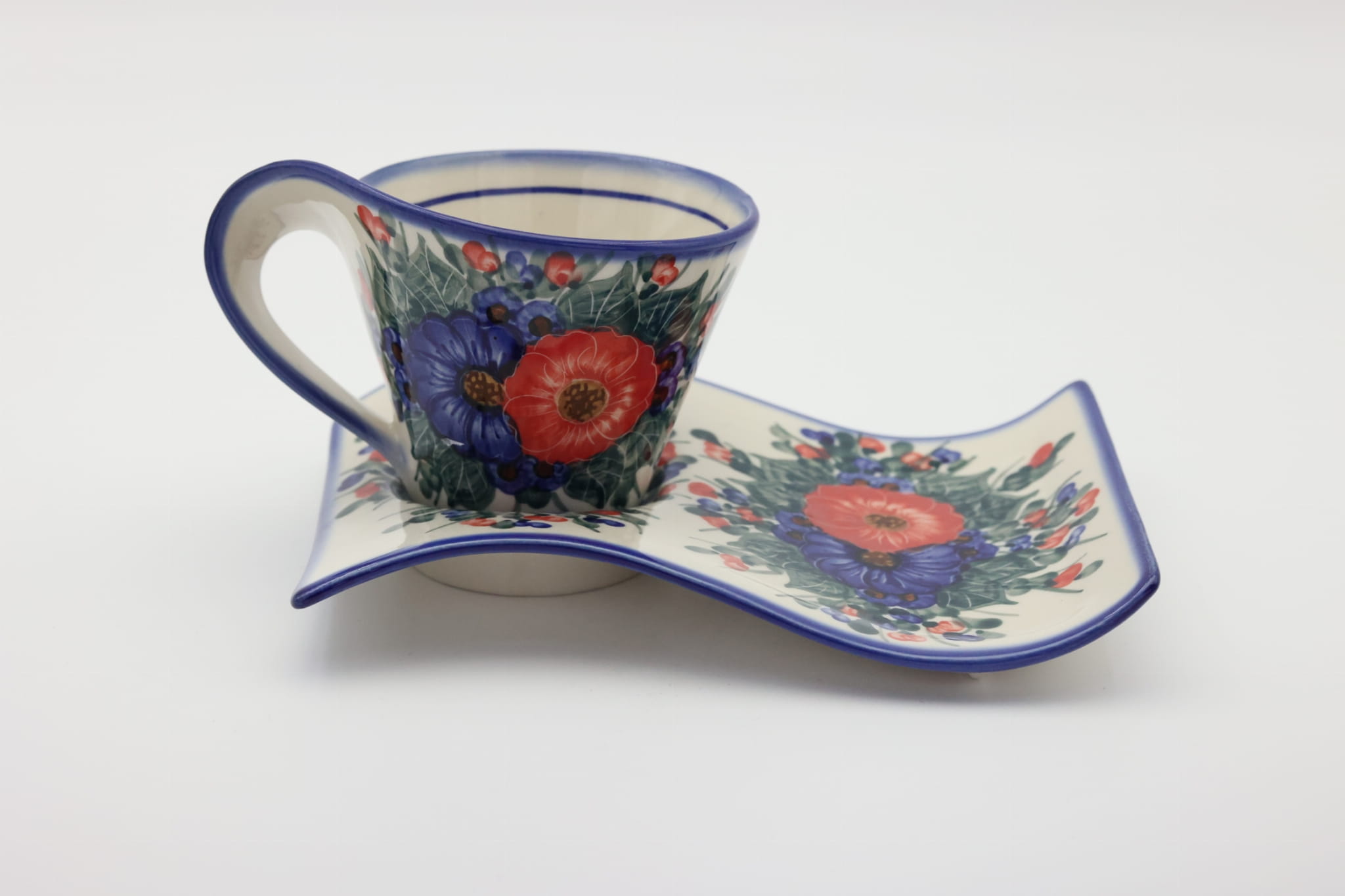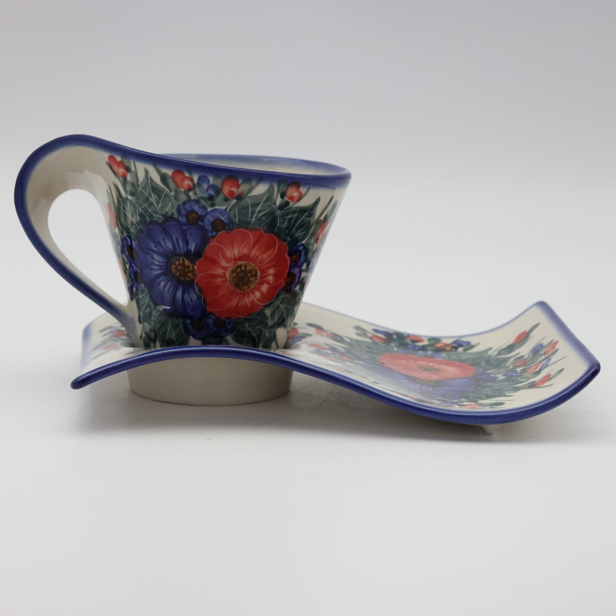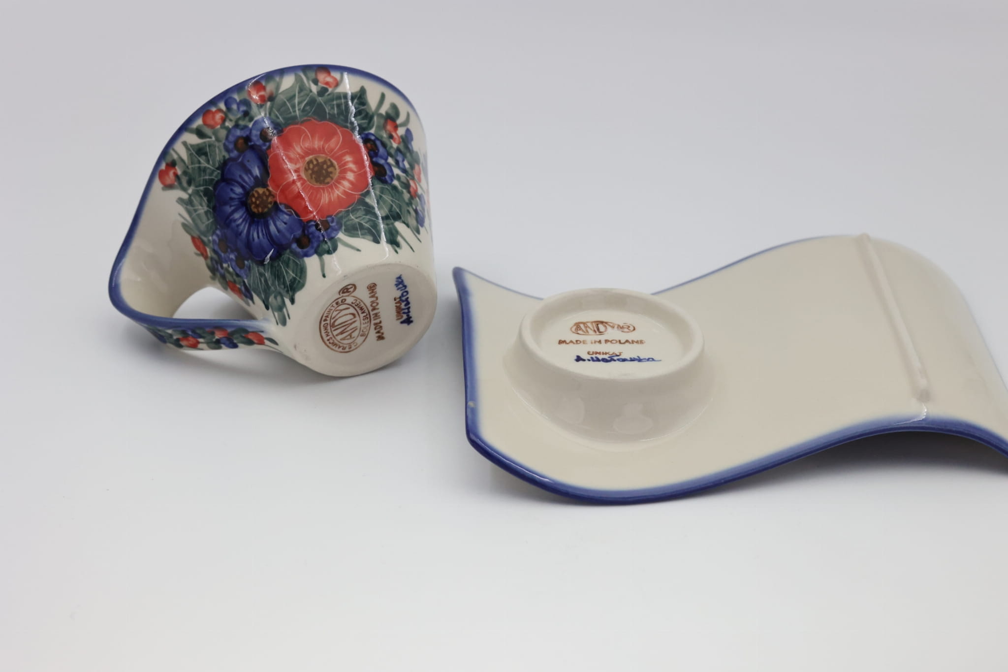 Kubek ceramiczny z tacką do oryginalnego podawania kawy, herbaty. Brzmi zbyt prosto dla tego kształtu, prawda? Oczywiście, że nie jest to zwykły kubek z tacką, to prawdziwe dzieło sztuki ceramiki bolesławieckiej powstałe w fabryce ANDY CERAMIKA.