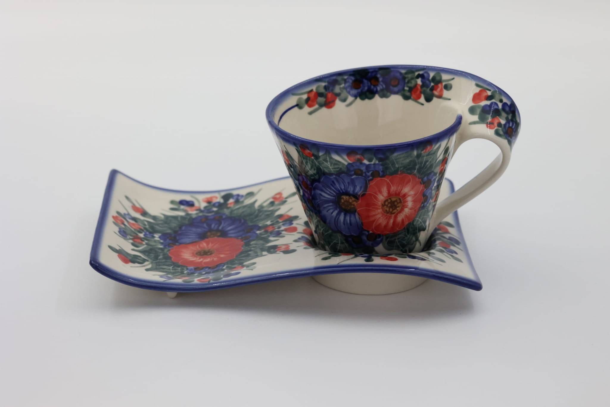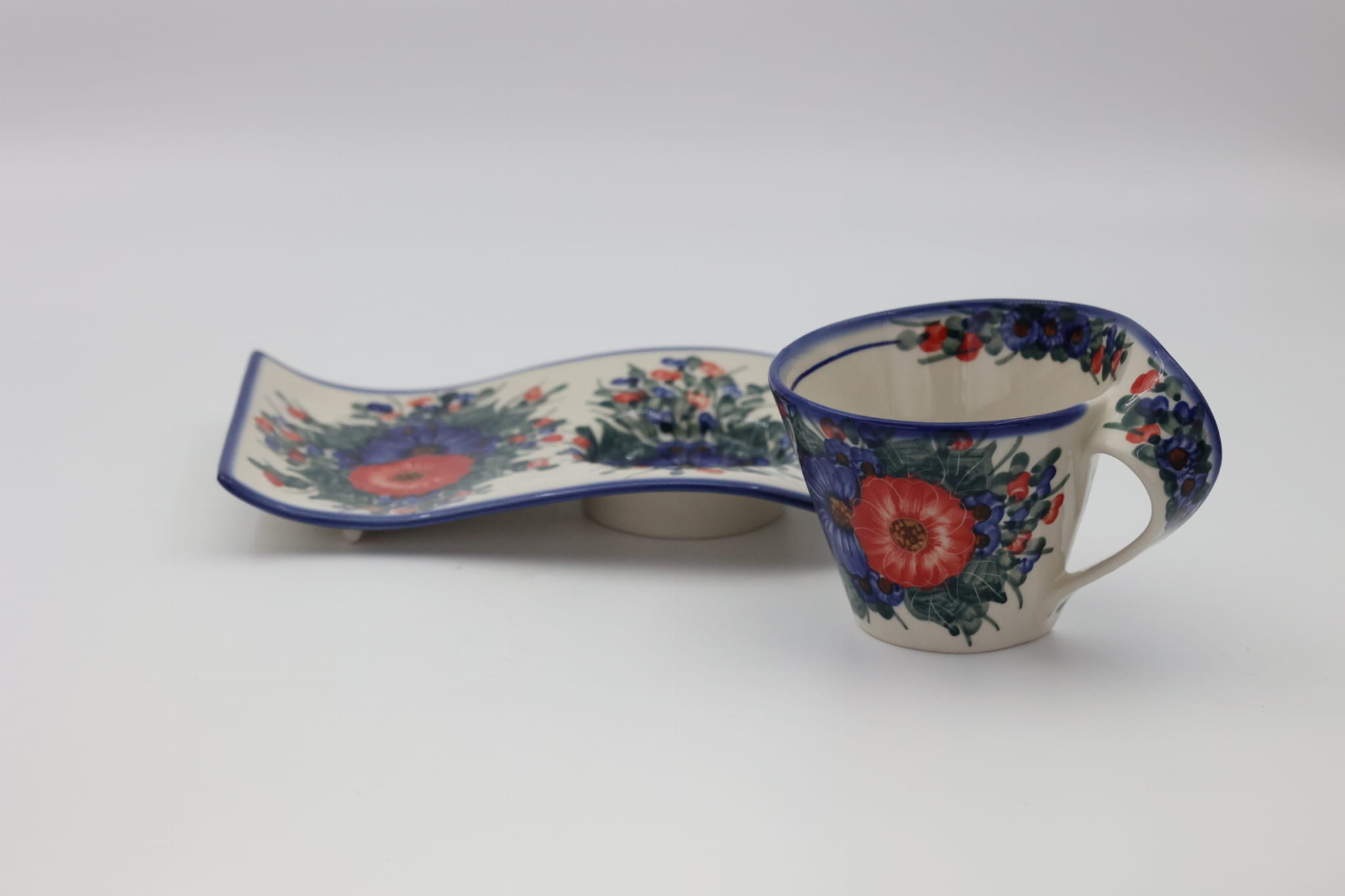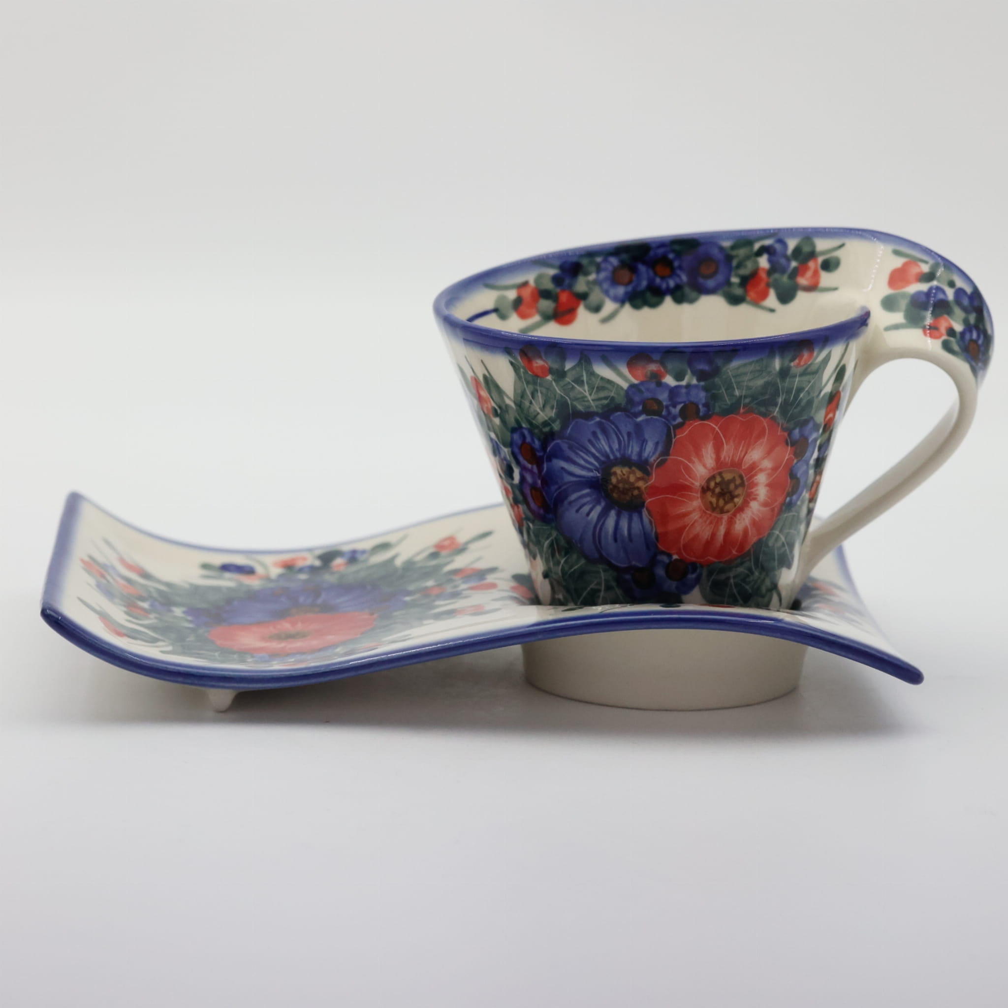 Kubek ceramiczny z tacką do oryginalnego podawania kawy, herbaty. Brzmi zbyt prosto dla tego kształtu, prawda? Oczywiście, że nie jest to zwykły kubek z tacką, to prawdziwe dzieło sztuki ceramiki bolesławieckiej powstałe w fabryce ANDY CERAMIKA.