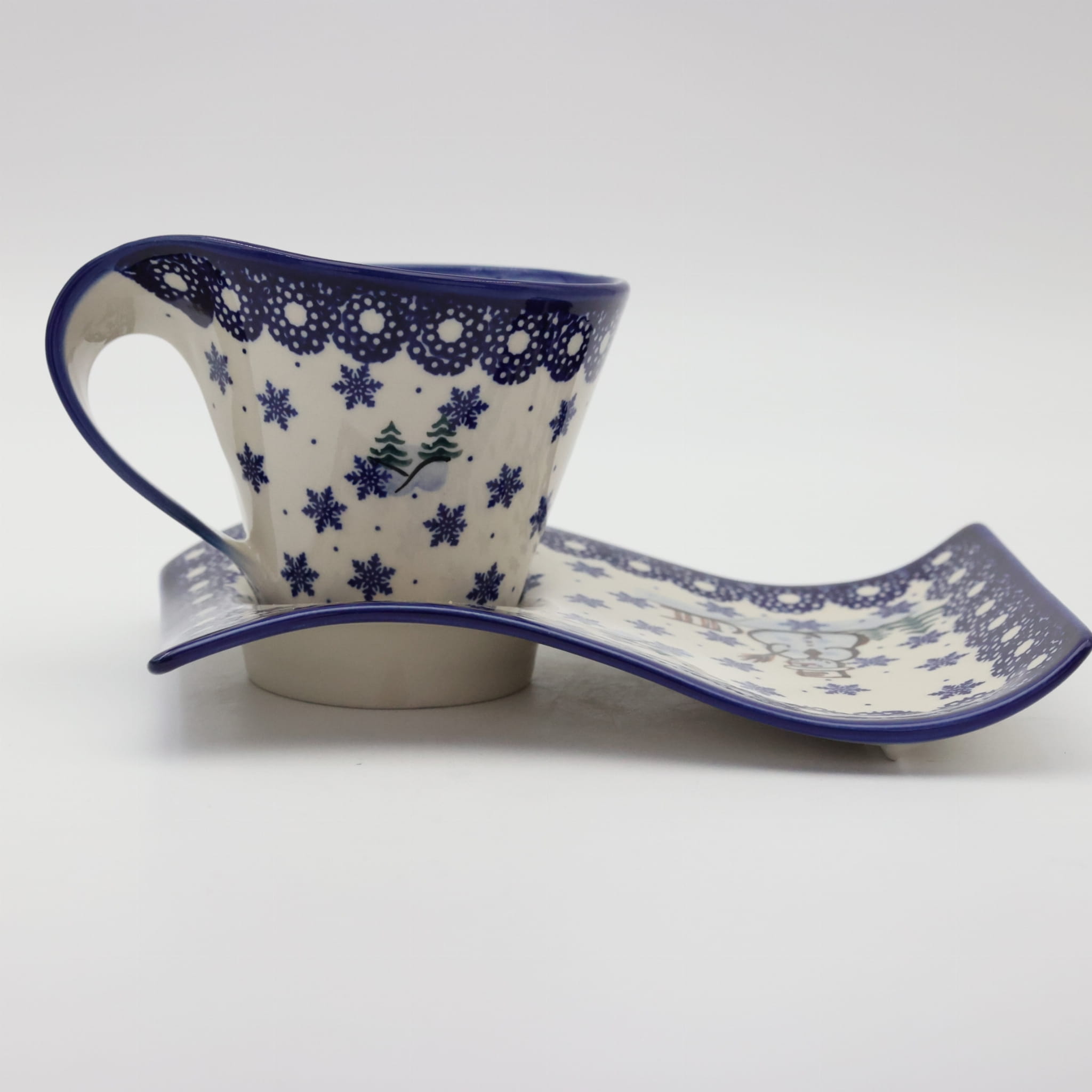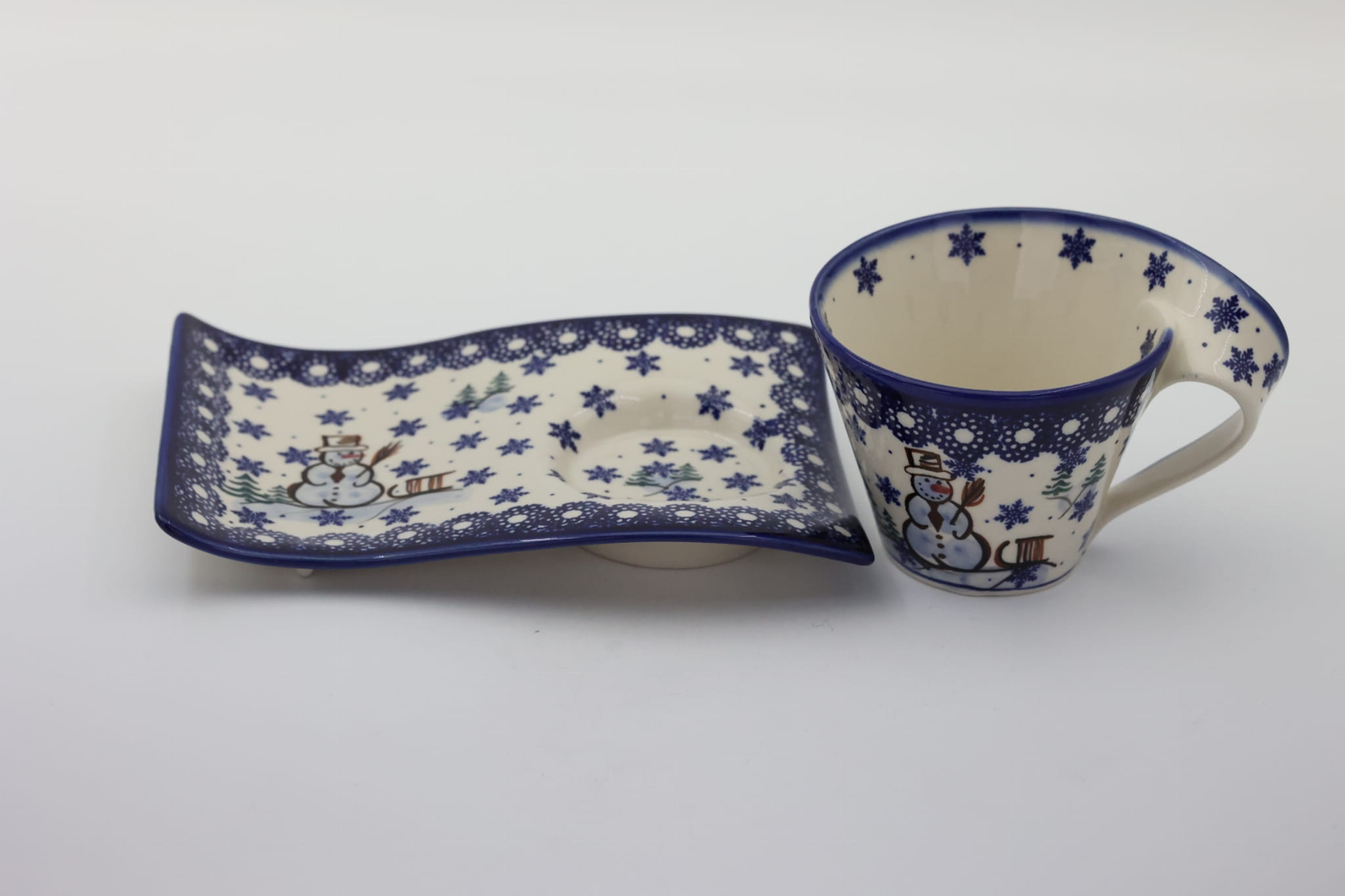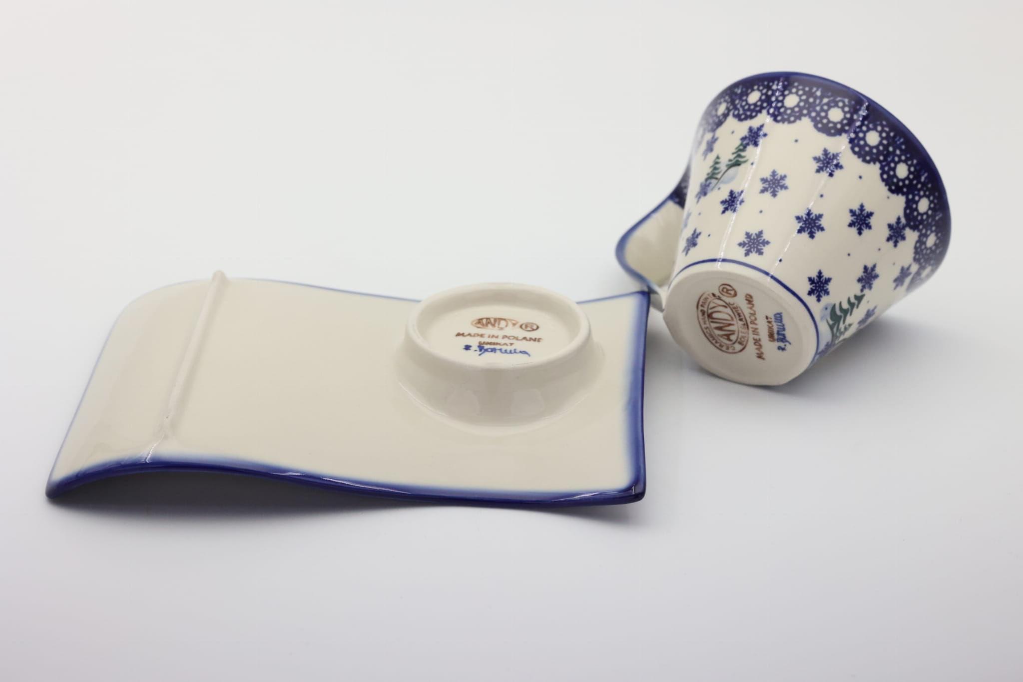 Kubek ceramiczny z tacką do oryginalnego podawania kawy, herbaty. Brzmi zbyt prosto dla tego kształtu, prawda? Oczywiście, że nie jest to zwykły kubek z tacką, to prawdziwe dzieło sztuki ceramiki bolesławieckiej powstałe w fabryce ANDY CERAMIKA.