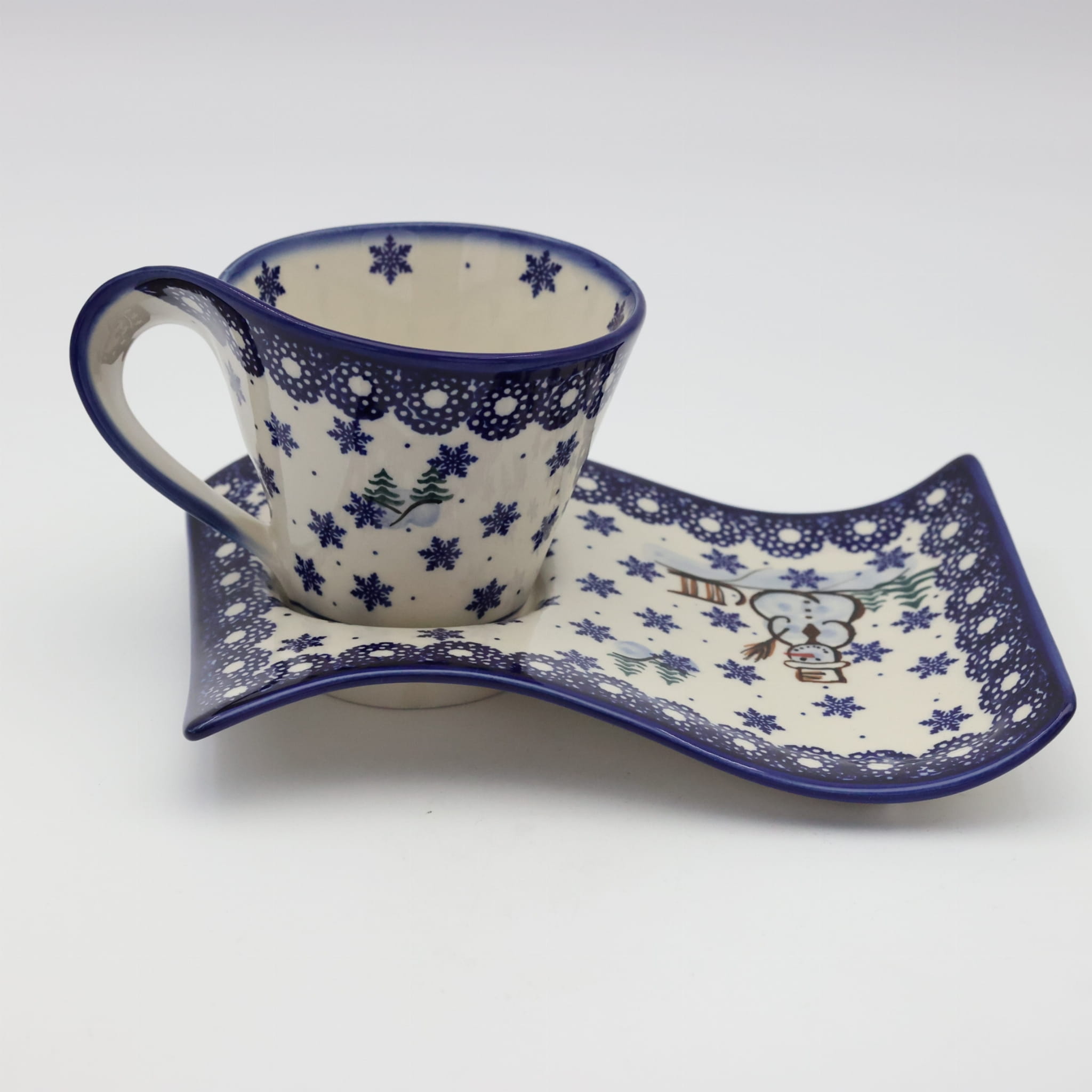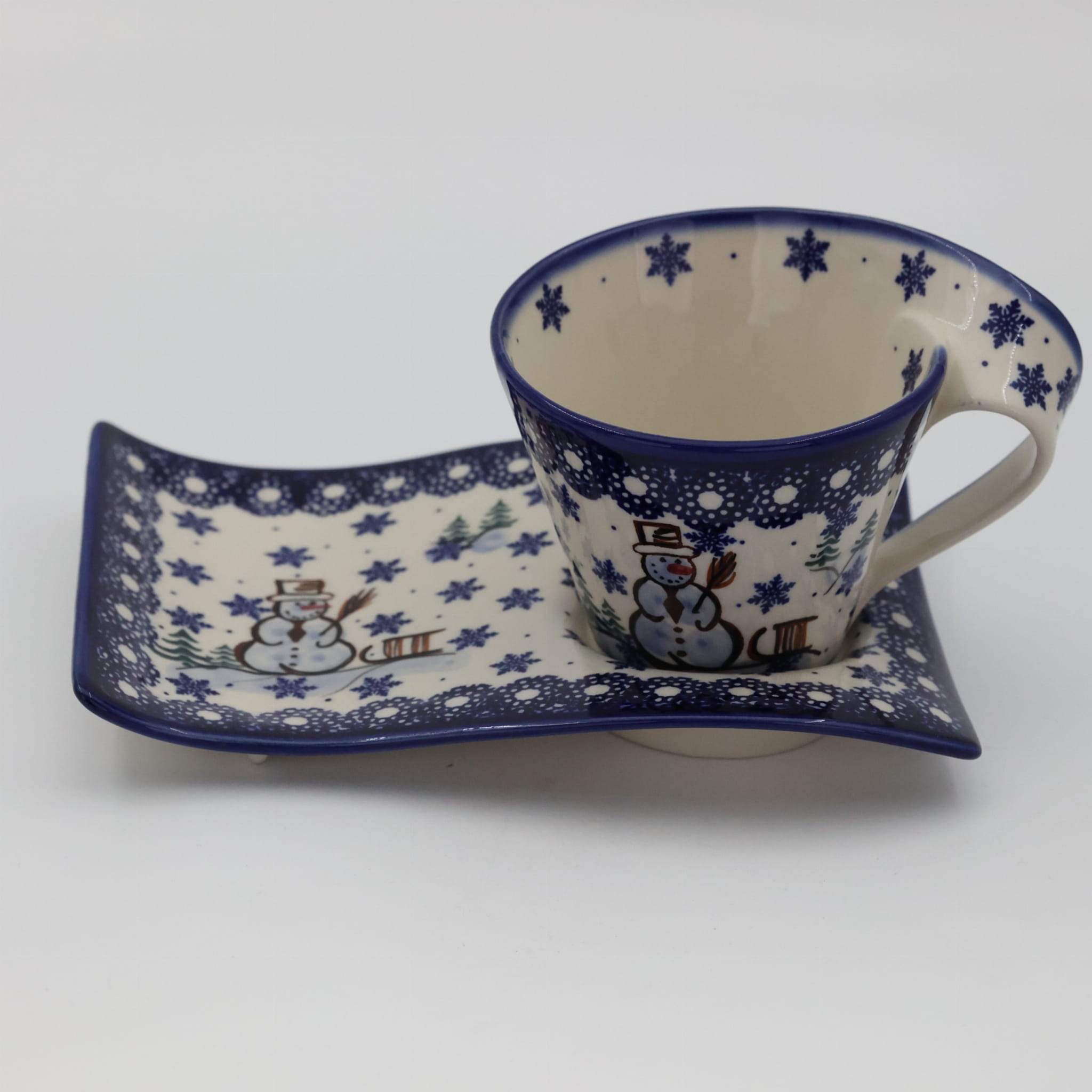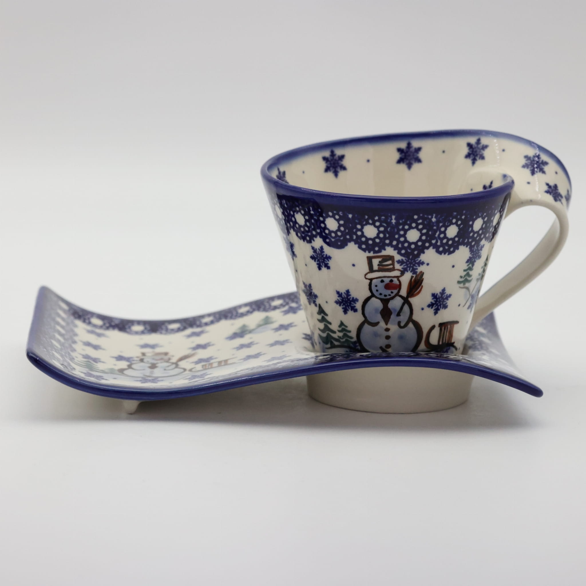 Kubek ceramiczny z tacką do oryginalnego podawania kawy, herbaty. Brzmi zbyt prosto dla tego kształtu, prawda? Oczywiście, że nie jest to zwykły kubek z tacką, to prawdziwe dzieło sztuki ceramiki bolesławieckiej powstałe w fabryce ANDY CERAMIKA.