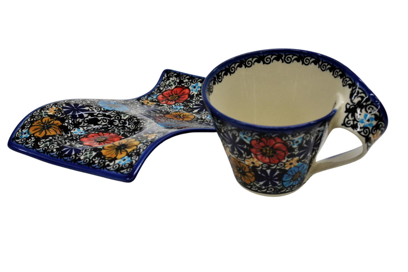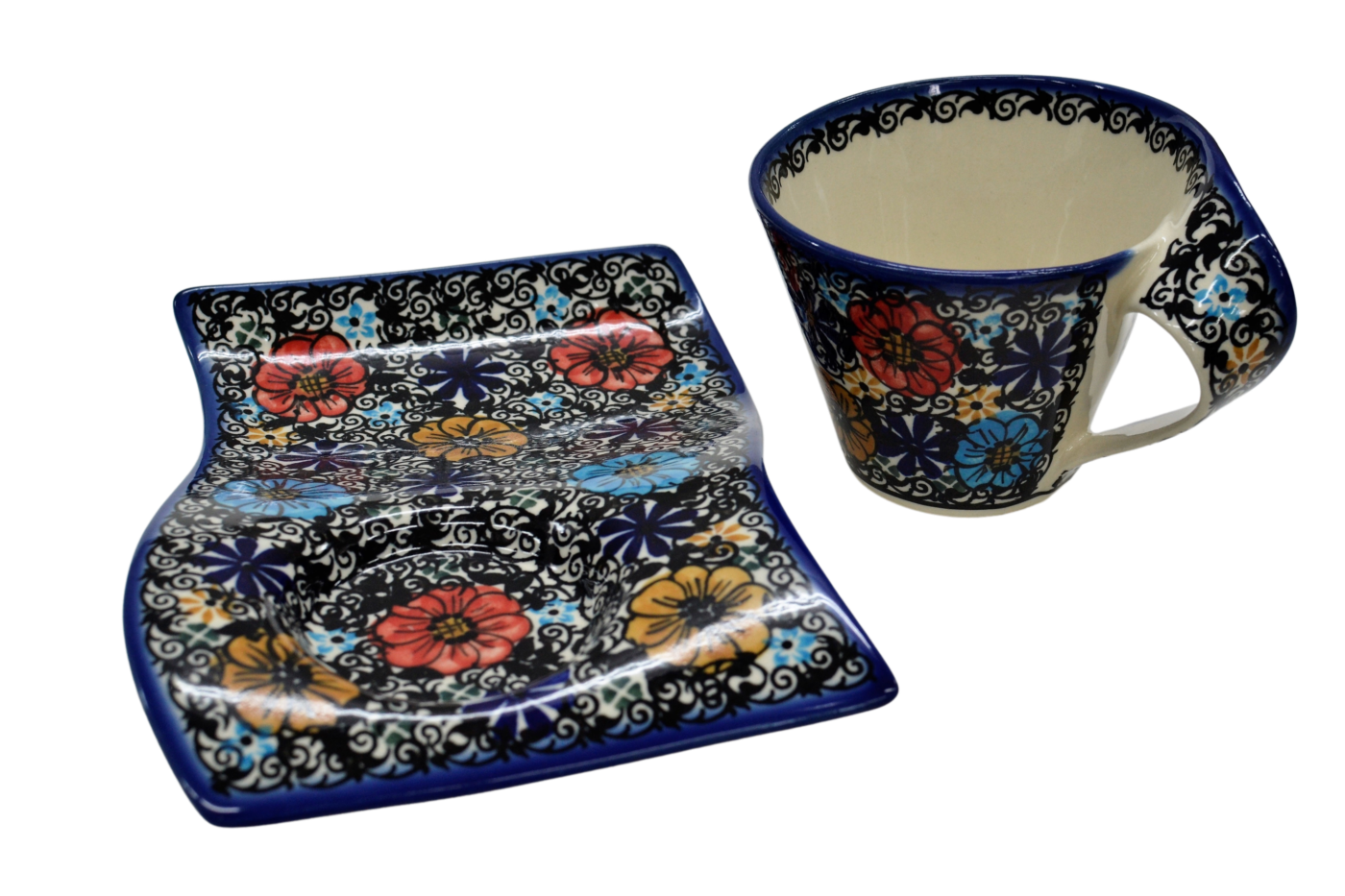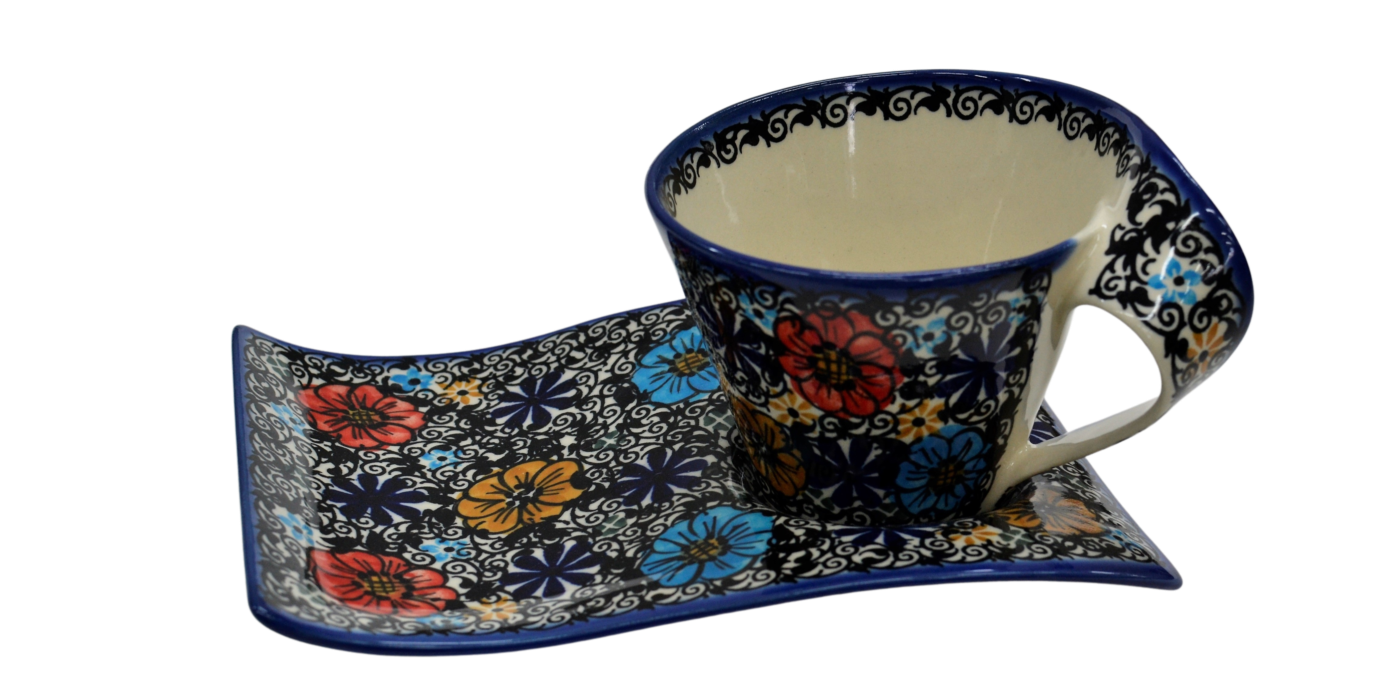 Kubek ceramiczny z tacką do oryginalnego podawania kawy, herbaty. Brzmi zbyt prosto dla tego kształtu, prawda? Oczywiście, że nie jest to zwykły kubek z tacką, to prawdziwe dzieło sztuki ceramiki bolesławieckiej powstałe w fabryce ANDY CERAMIKA.
