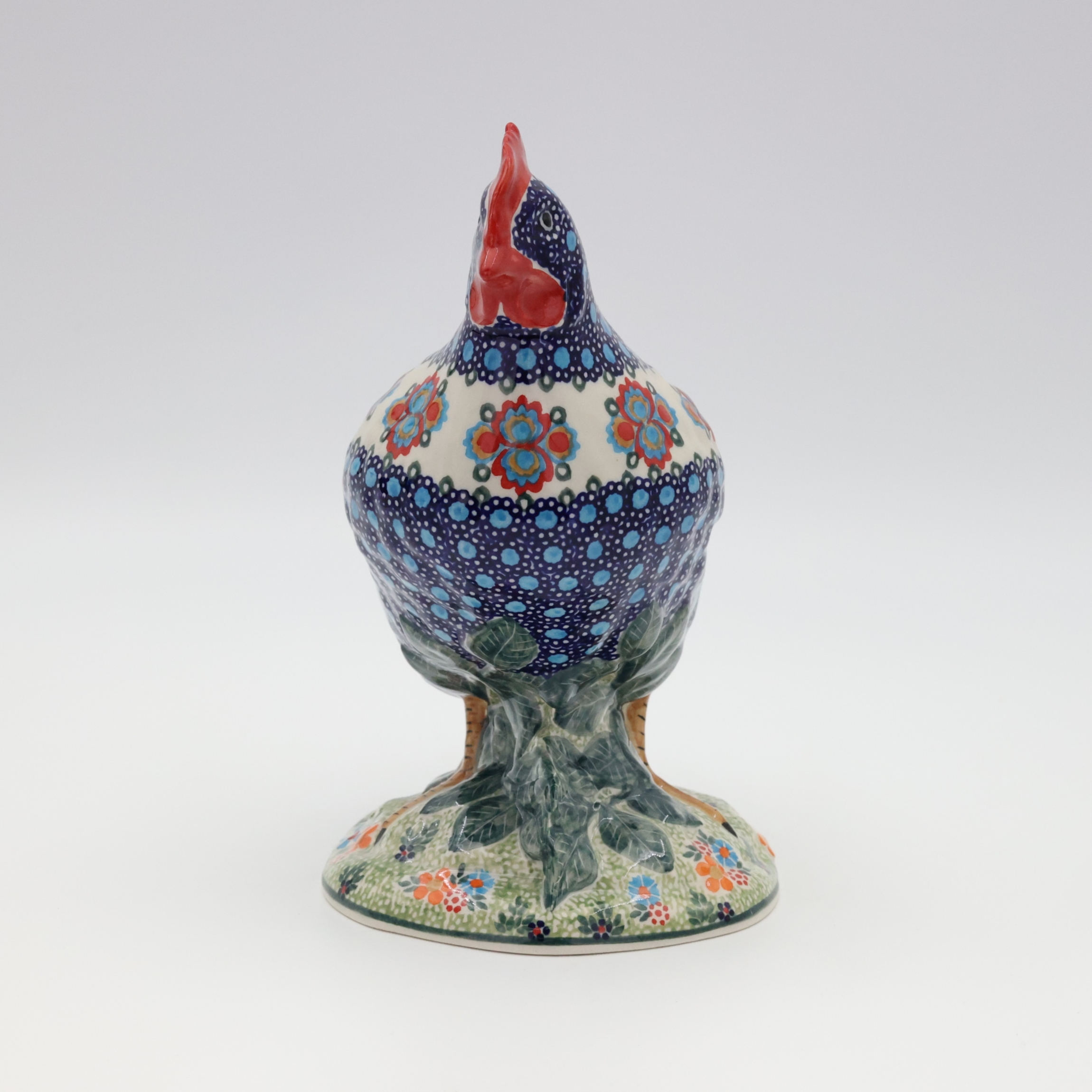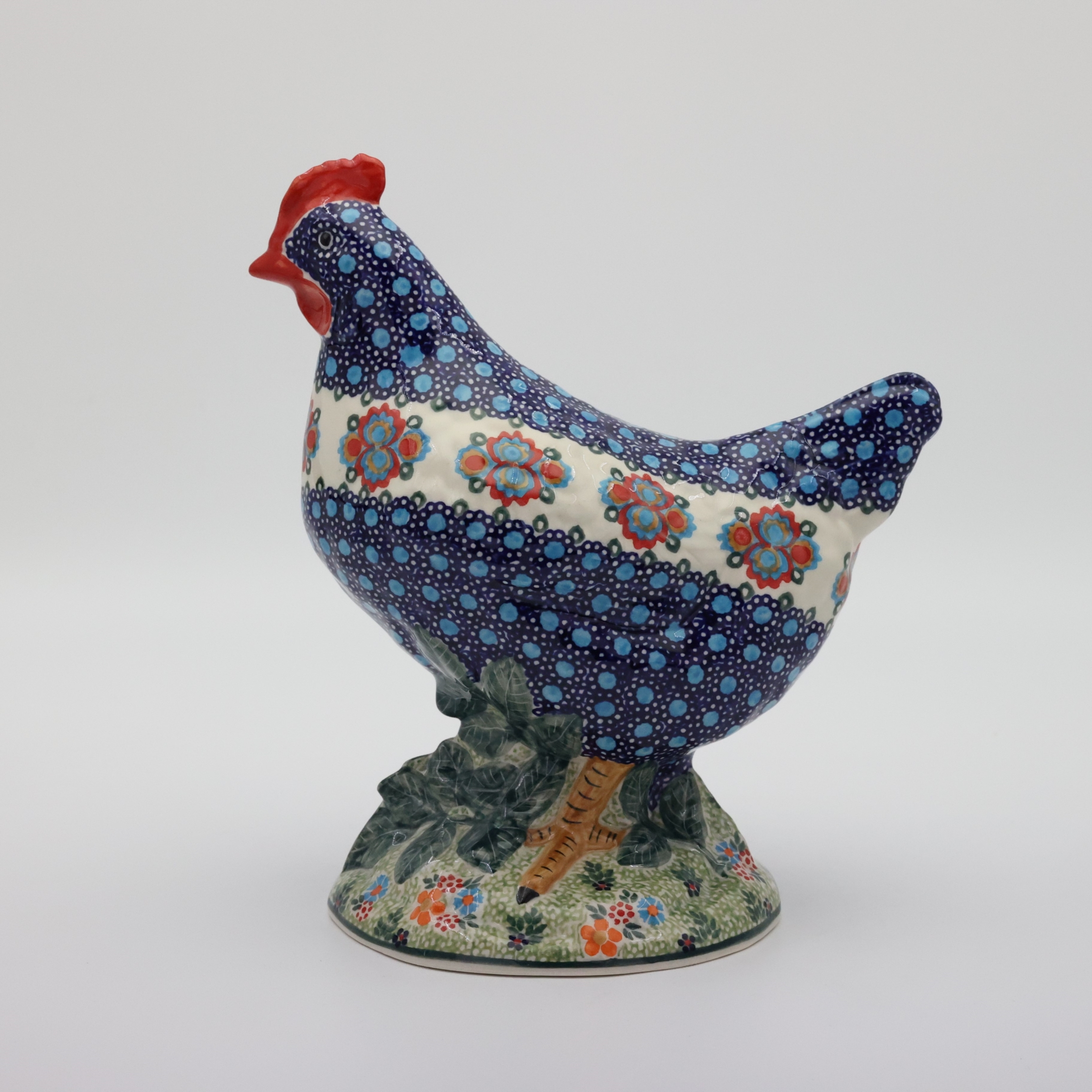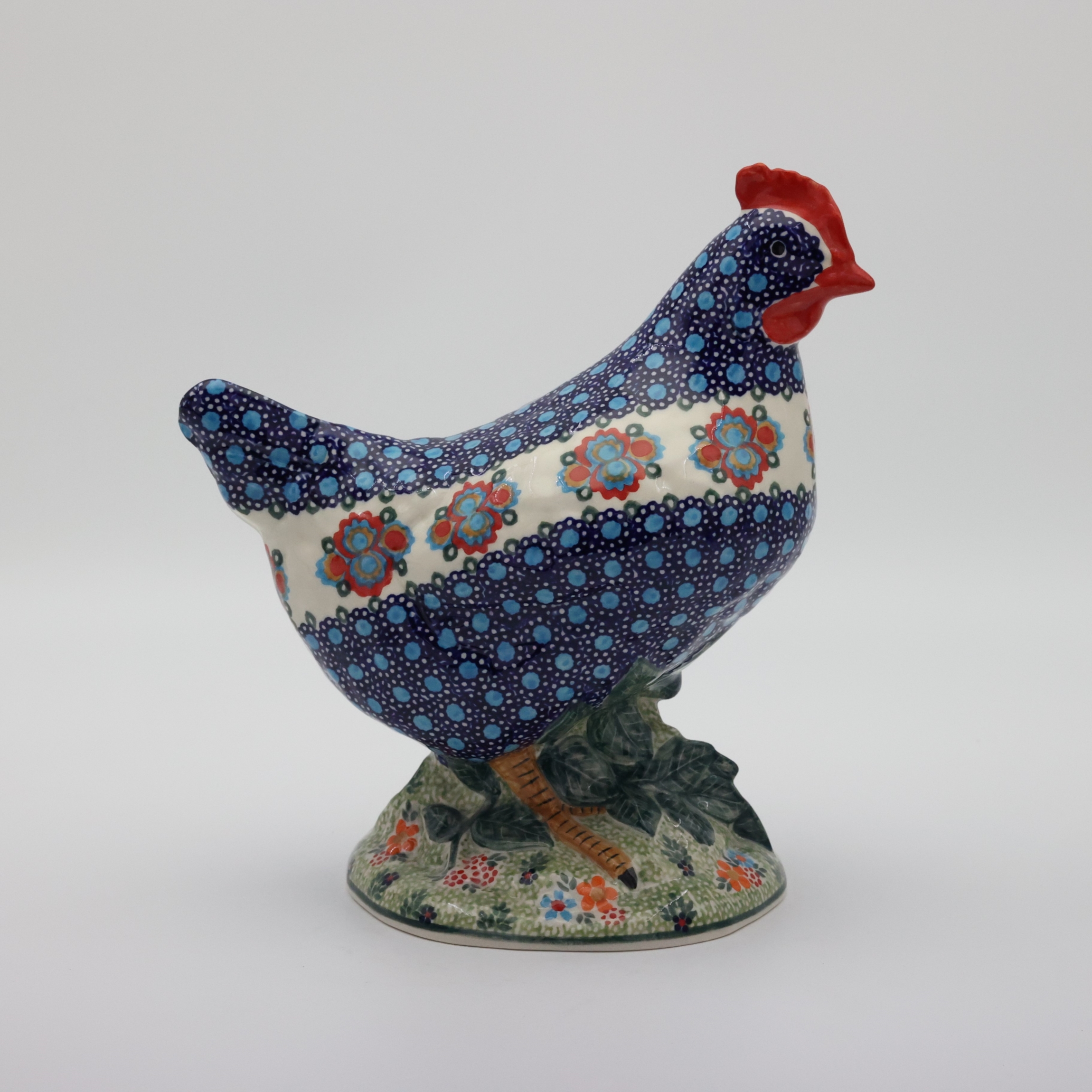 Ożyw swój dom i ogród wyjątkową kurą ceramiczną z Bolesławca, zdobioną tradycyjną metodą stempelkową. Każda figurka to unikalne dzieło sztuki, ręcznie malowane przez utalentowanych artystów, którzy tworzą bogate, kolorowe wzory inspirowane naturą. Nasza kura zachwyca detalami – pełna wiosennych kwiatów, barwnych akcentów i wielkanocnych zdobień, stanie się niepowtarzalnym elementem Twojej świątecznej aranżacji.