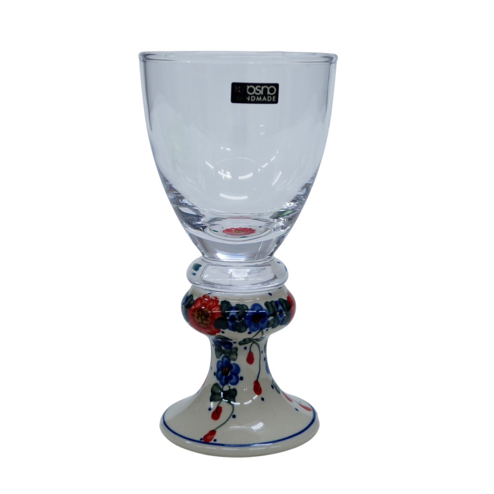 Przedstawiamy oryginalną i wyjątkową lampkę do wina o pojemności 300 ml. Trwałe połączenie szkła z jednej z największych hut szkła w Polsce, z Krosna, z ceramiką bolesławiecką zdobioną głównie w motywy kwiatowe i stempelkowe.