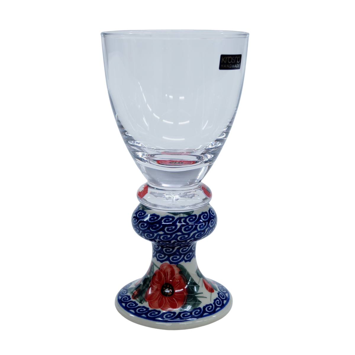 Przedstawiamy oryginalną i wyjątkową lampkę do wina o pojemności 300 ml. Trwałe połączenie szkła z jednej z największych hut szkła w Polsce, z Krosna, z ceramiką bolesławiecką zdobioną głównie w motywy kwiatowe i stempelkowe.