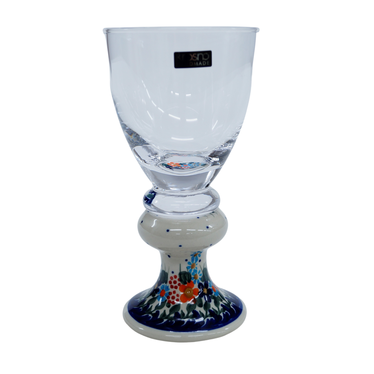 Przedstawiamy oryginalną i wyjątkową lampkę do wina o pojemności 300 ml. Trwałe połączenie szkła z jednej z największych hut szkła w Polsce, z Krosna, z ceramiką bolesławiecką zdobioną głównie w motywy kwiatowe i stempelkowe.