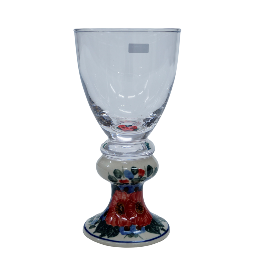 Przedstawiamy oryginalną i wyjątkową lampkę do wina o pojemności 300 ml. Trwałe połączenie szkła z jednej z największych hut szkła w Polsce, z Krosna, z ceramiką bolesławiecką zdobioną głównie w motywy kwiatowe i stempelkowe.