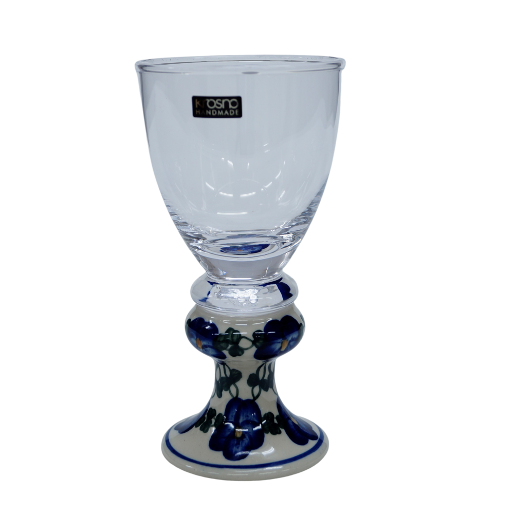 Przedstawiamy oryginalną i wyjątkową lampkę do wina o pojemności 300 ml. Trwałe połączenie szkła z jednej z największych hut szkła w Polsce, z Krosna, z ceramiką bolesławiecką zdobioną głównie w motywy kwiatowe i stempelkowe.