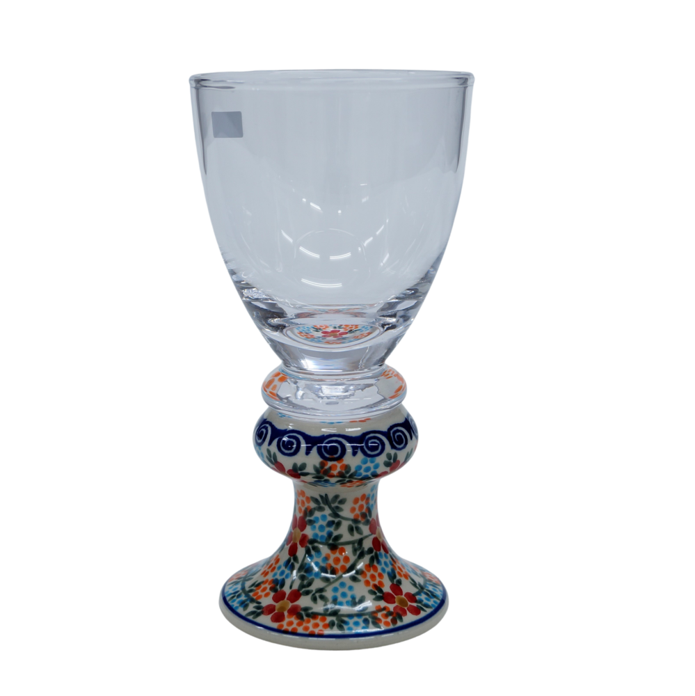 Przedstawiamy oryginalną i wyjątkową lampkę do wina o pojemności 300 ml. Trwałe połączenie szkła z jednej z największych hut szkła w Polsce, z Krosna, z ceramiką bolesławiecką zdobioną głównie w motywy kwiatowe i stempelkowe.