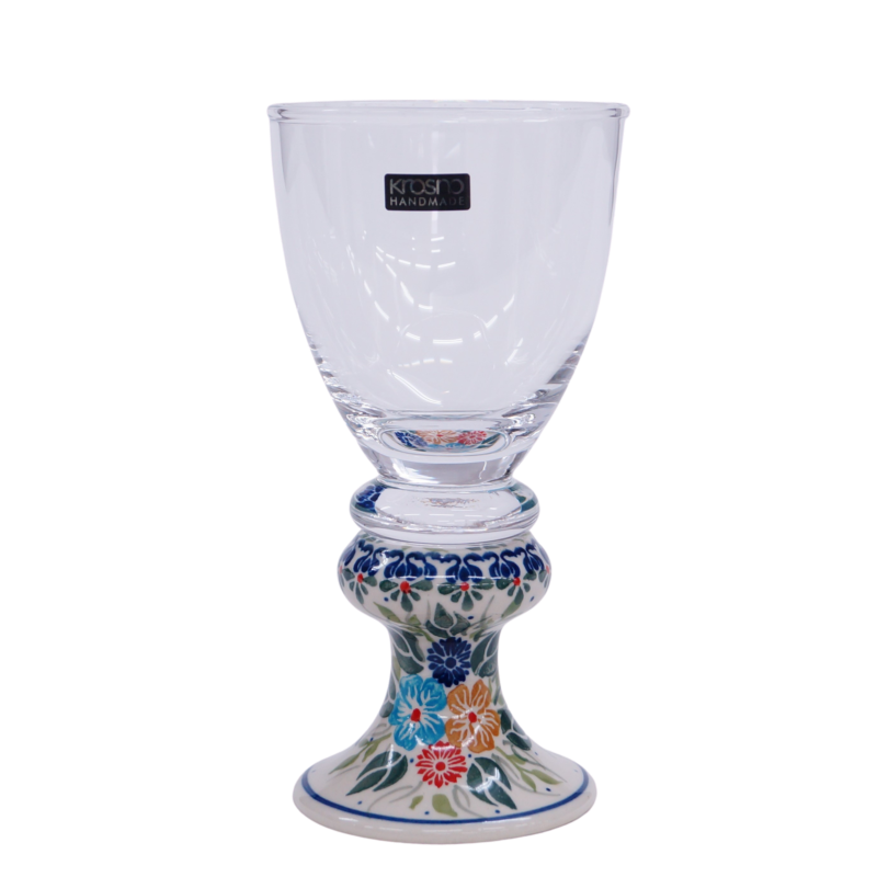 Przedstawiamy oryginalną i wyjątkową lampkę do wina o pojemności 300 ml. Trwałe połączenie szkła z jednej z największych hut szkła w Polsce, z Krosna, z ceramiką bolesławiecką zdobioną głównie w motywy kwiatowe i stempelkowe.