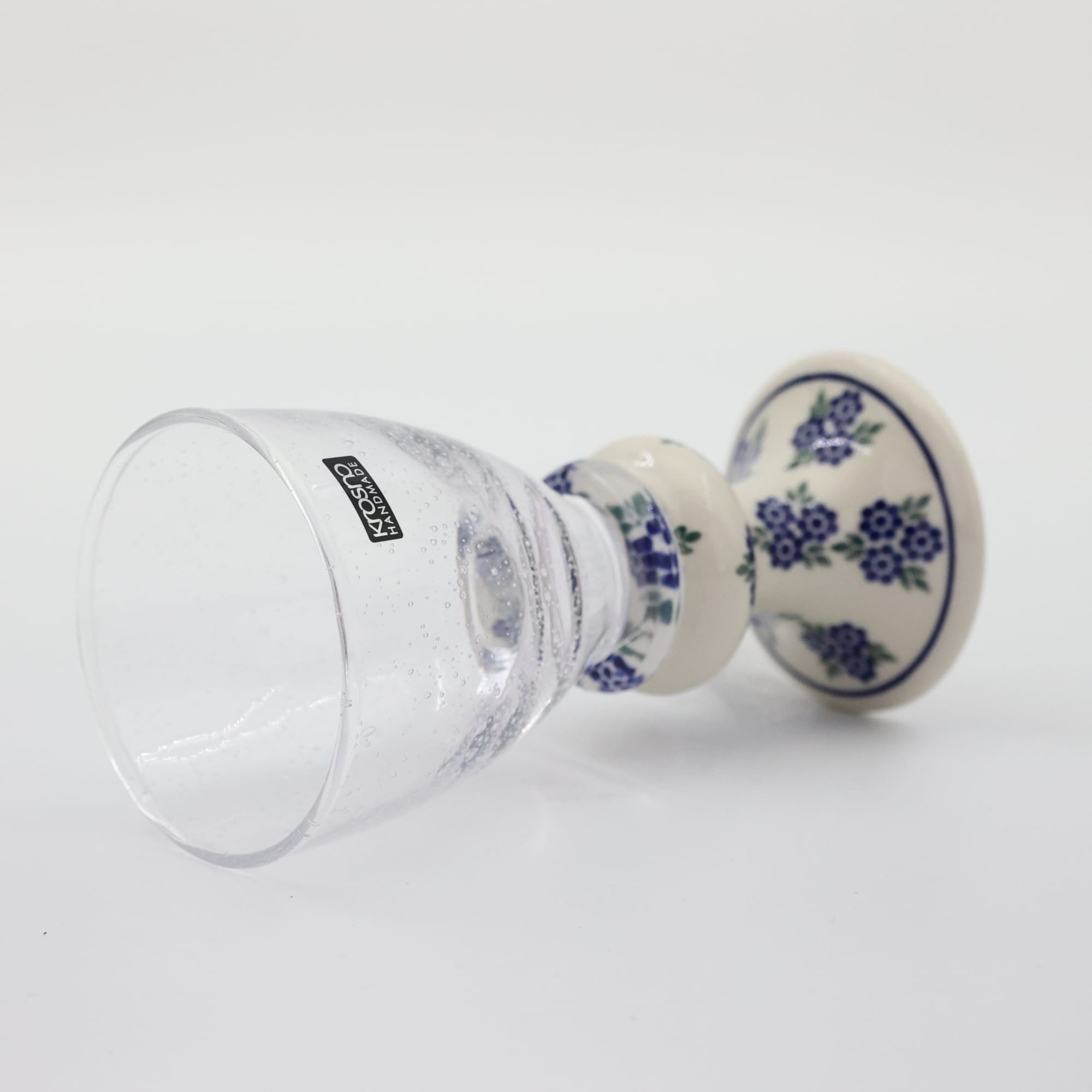 Przedstawiamy oryginalną i wyjątkową lampkę do wina o pojemności 300 ml, ze szkłem z bąbelkami (pęcherzykami powietrza zatopionymi we szkle). Trwałe połączenie szkła z jednej z największych hut szkła w Polsce, z Krosna, z ceramiką bolesławiecką zdobioną głównie w motywy kwiatowe i stempelkowe.