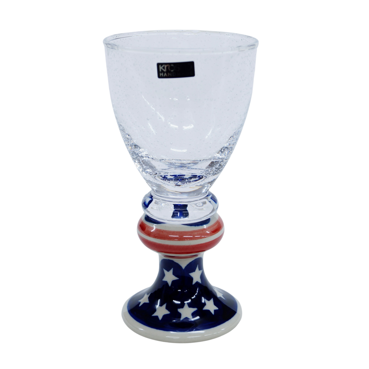 Przedstawiamy oryginalną i wyjątkową lampkę do wina o pojemności 300 ml, ze szkłem z bąbelkami (pęcherzykami powietrza zatopionymi we szkle). Trwałe połączenie szkła z jednej z największych hut szkła w Polsce, z Krosna, z ceramiką bolesławiecką zdobioną głównie w motywy kwiatowe i stempelkowe.