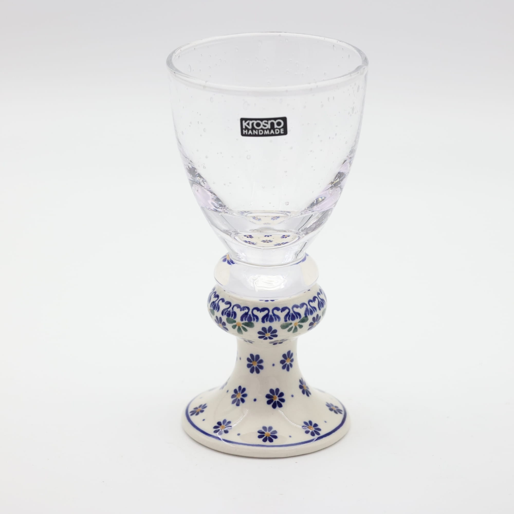 Przedstawiamy oryginalną i wyjątkową lampkę do wina o pojemności 300 ml, ze szkłem z bąbelkami (pęcherzykami powietrza zatopionymi we szkle). Trwałe połączenie szkła z jednej z największych hut szkła w Polsce, z Krosna, z ceramiką bolesławiecką zdobioną głównie w motywy kwiatowe i stempelkowe.