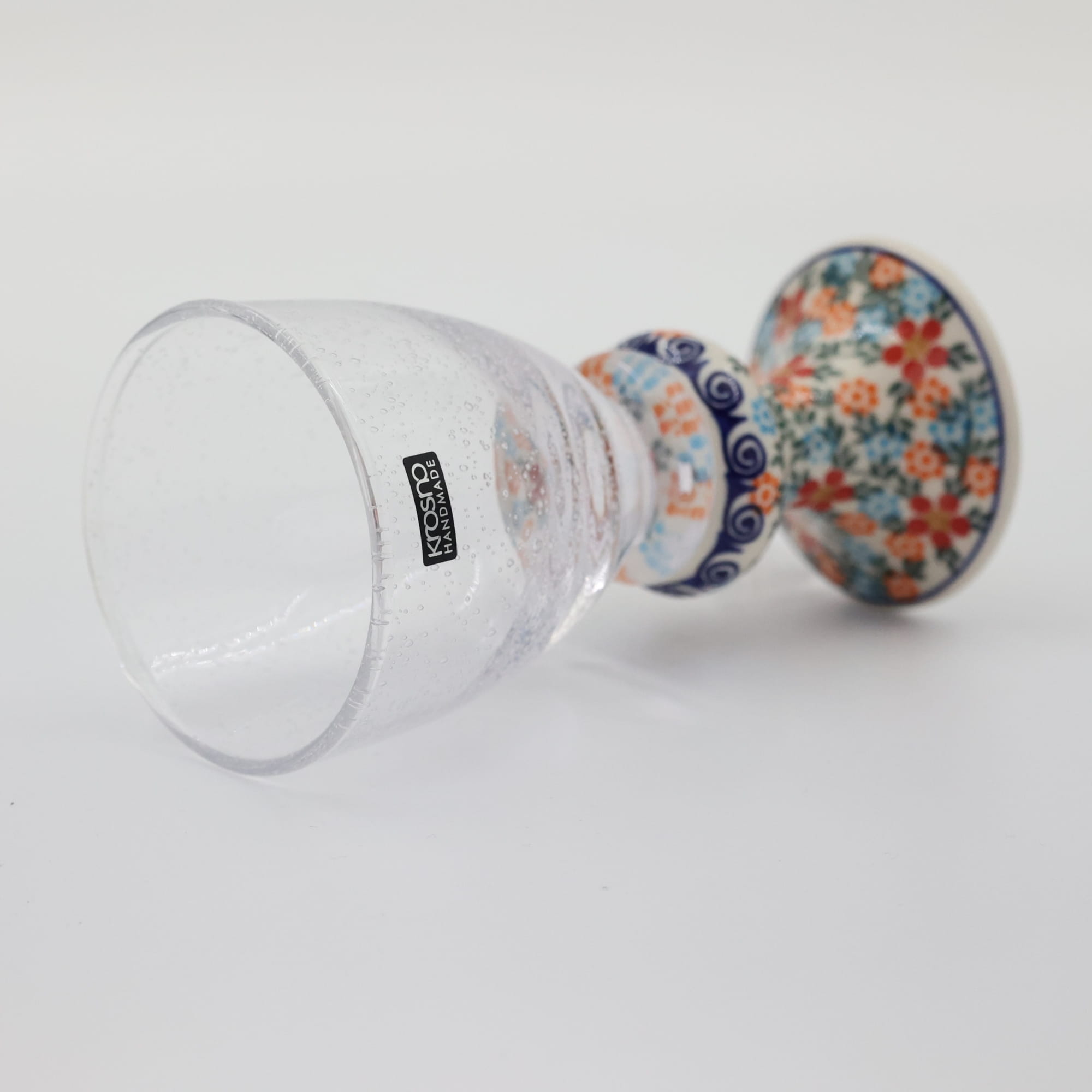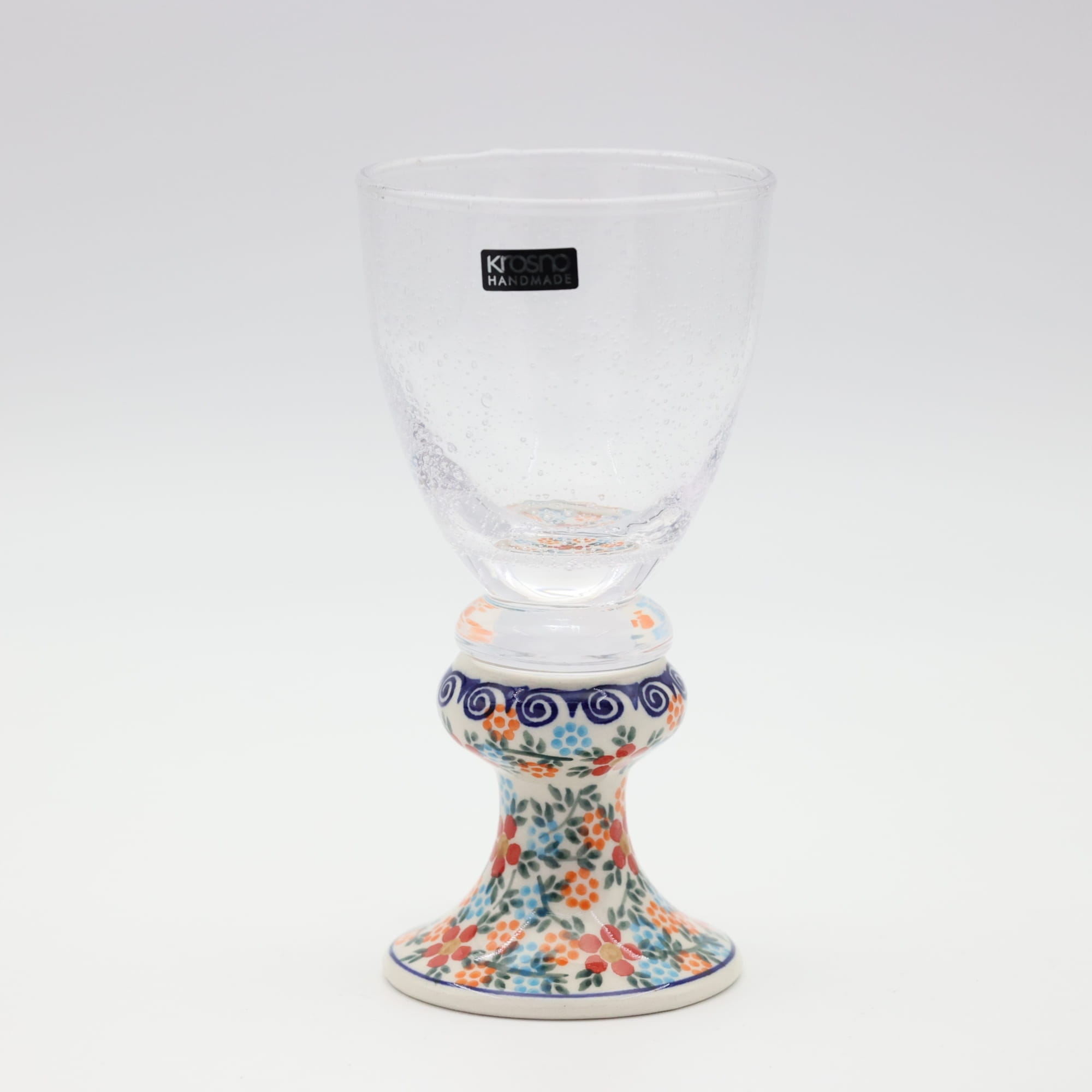 Przedstawiamy oryginalną i wyjątkową lampkę do wina o pojemności 300 ml, ze szkłem z bąbelkami (pęcherzykami powietrza zatopionymi we szkle). Trwałe połączenie szkła z jednej z największych hut szkła w Polsce, z Krosna, z ceramiką bolesławiecką zdobioną głównie w motywy kwiatowe i stempelkowe.