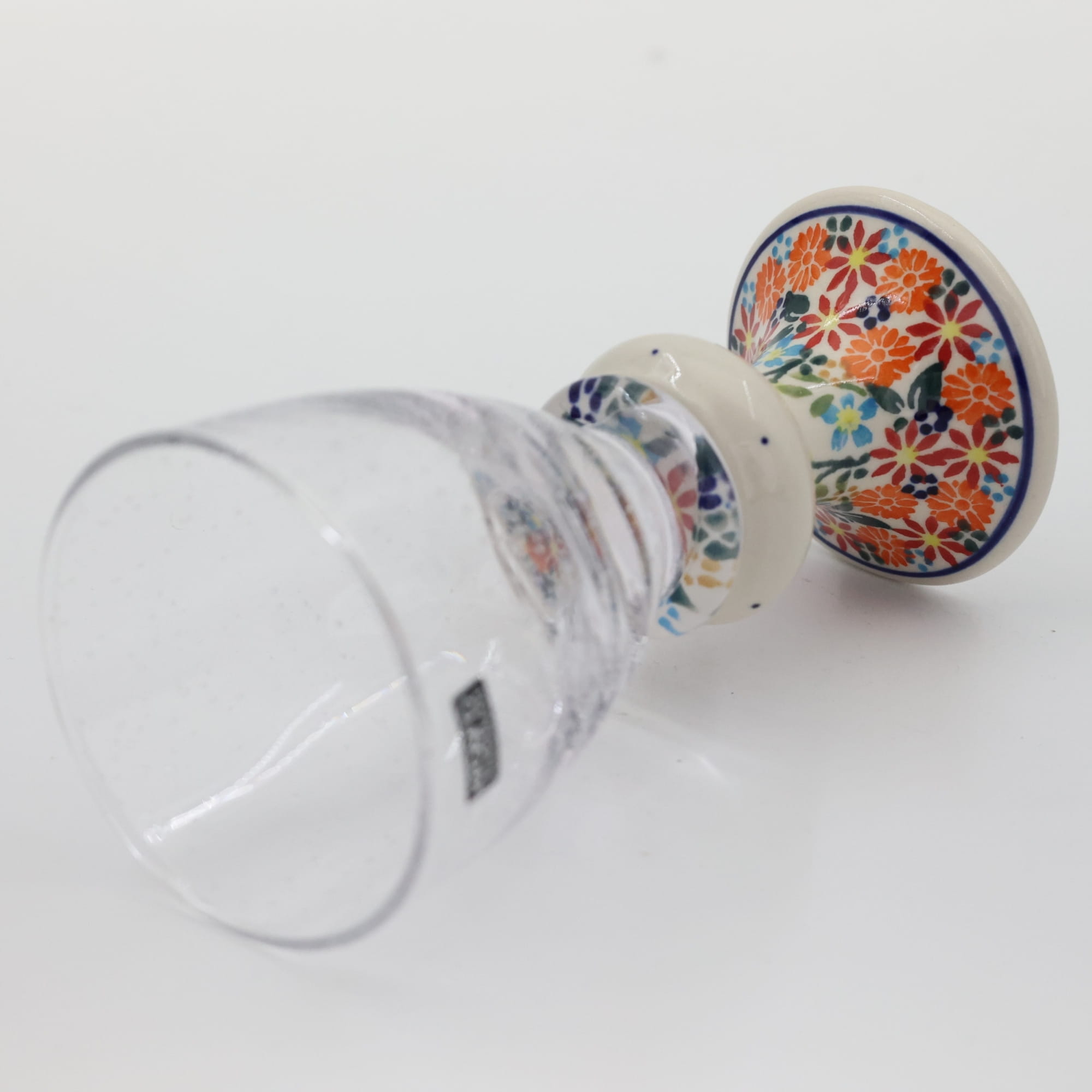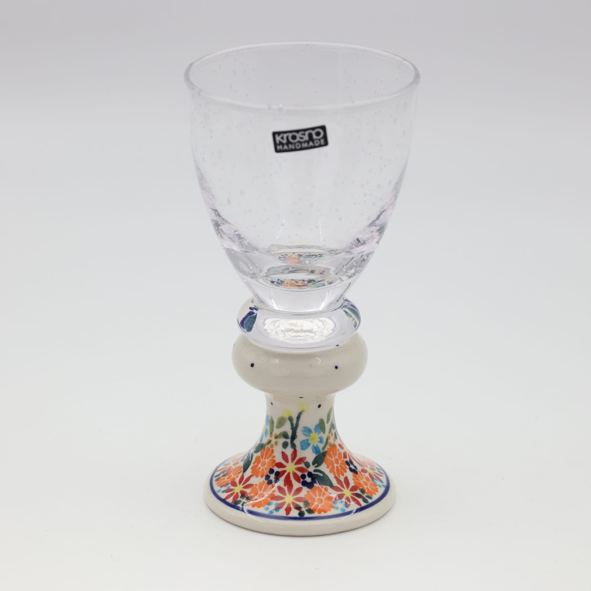 Przedstawiamy oryginalną i wyjątkową lampkę do wina o pojemności 300 ml, ze szkłem z bąbelkami (pęcherzykami powietrza zatopionymi we szkle). Trwałe połączenie szkła z jednej z największych hut szkła w Polsce, z Krosna, z ceramiką bolesławiecką zdobioną głównie w motywy kwiatowe i stempelkowe.
