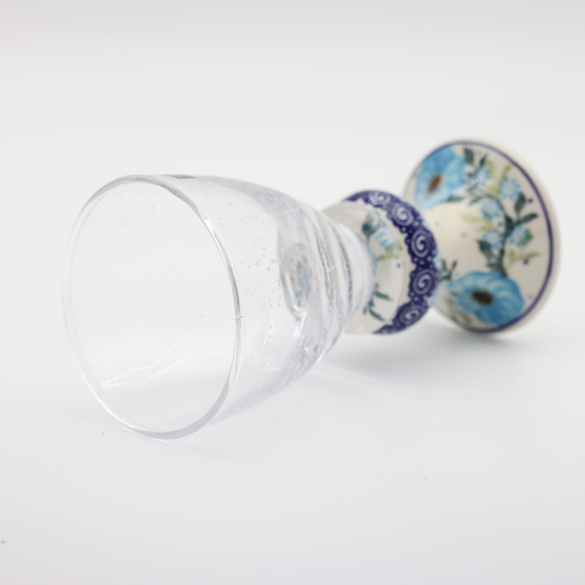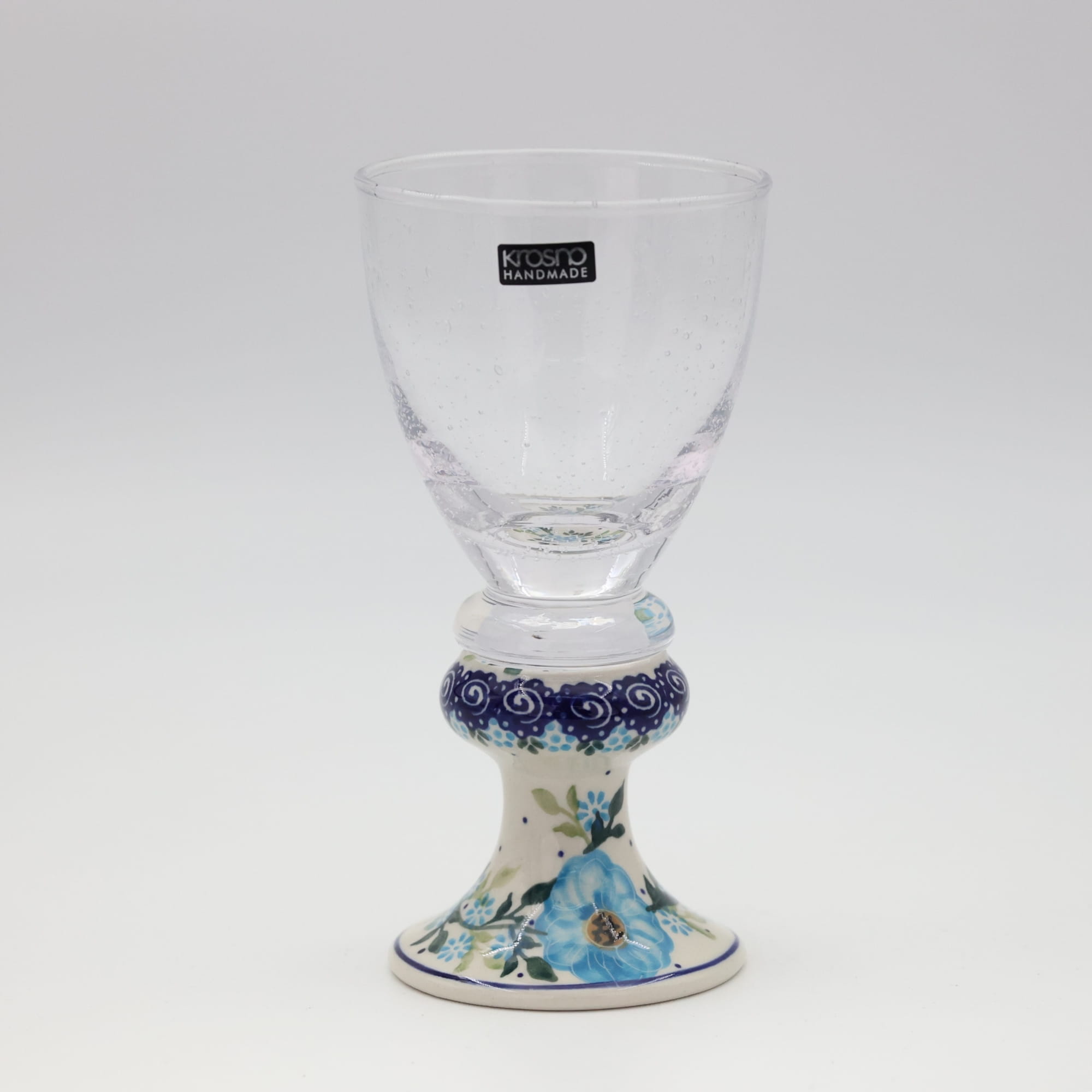 Przedstawiamy oryginalną i wyjątkową lampkę do wina o pojemności 300 ml, ze szkłem z bąbelkami (pęcherzykami powietrza zatopionymi we szkle). Trwałe połączenie szkła z jednej z największych hut szkła w Polsce, z Krosna, z ceramiką bolesławiecką zdobioną głównie w motywy kwiatowe i stempelkowe.