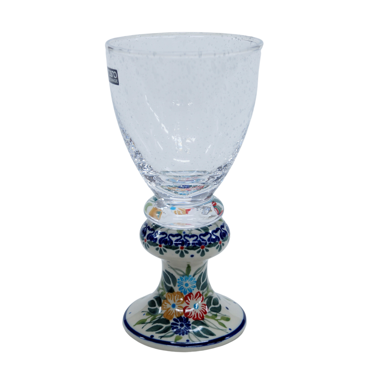Przedstawiamy oryginalną i wyjątkową lampkę do wina o pojemności 300 ml, ze szkłem z bąbelkami (pęcherzykami powietrza zatopionymi we szkle). Trwałe połączenie szkła z jednej z największych hut szkła w Polsce, z Krosna, z ceramiką bolesławiecką zdobioną głównie w motywy kwiatowe i stempelkowe.