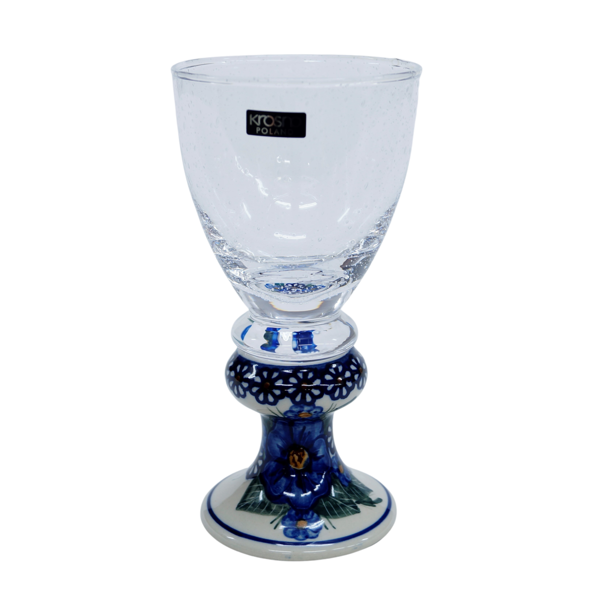 Przedstawiamy oryginalną i wyjątkową lampkę do wina o pojemności 300 ml, ze szkłem z bąbelkami (pęcherzykami powietrza zatopionymi we szkle). Trwałe połączenie szkła z jednej z największych hut szkła w Polsce, z Krosna, z ceramiką bolesławiecką zdobioną głównie w motywy kwiatowe i stempelkowe.