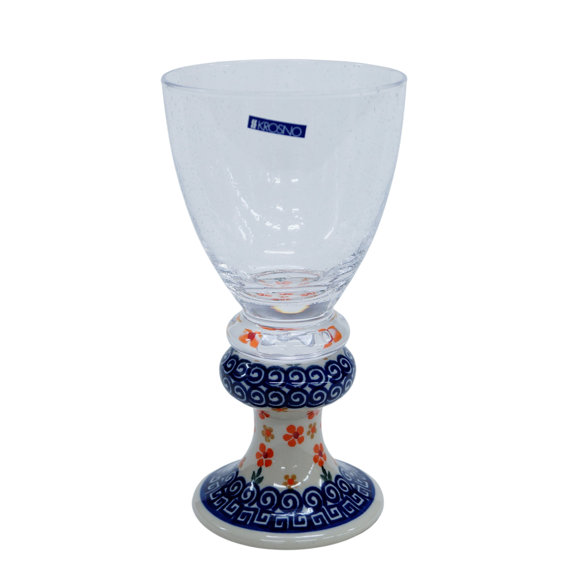 Przedstawiamy oryginalną i wyjątkową lampkę do wina o pojemności 300 ml, ze szkłem z bąbelkami (pęcherzykami powietrza zatopionymi we szkle). Trwałe połączenie szkła z jednej z największych hut szkła w Polsce, z Krosna, z ceramiką bolesławiecką zdobioną głównie w motywy kwiatowe i stempelkowe.