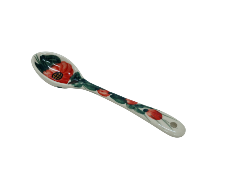 Łyżka ceramiczna deserowa mała, to jeden z podstawowych elementów wyposażenia kuchni, ręcznie malowana w unikatowe dekoracje kwiatowe i stempelkowe, wyprodukowana w bolesławieckiej manufakturze ceramiki artystycznej.
