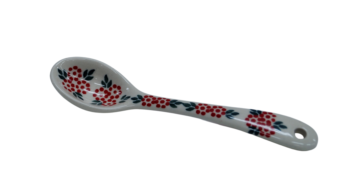 Łyżka ceramiczna deserowa mała, to jeden z podstawowych elementów wyposażenia kuchni, ręcznie malowana w unikatowe dekoracje kwiatowe i stempelkowe, wyprodukowana w bolesławieckiej manufakturze ceramiki artystycznej.