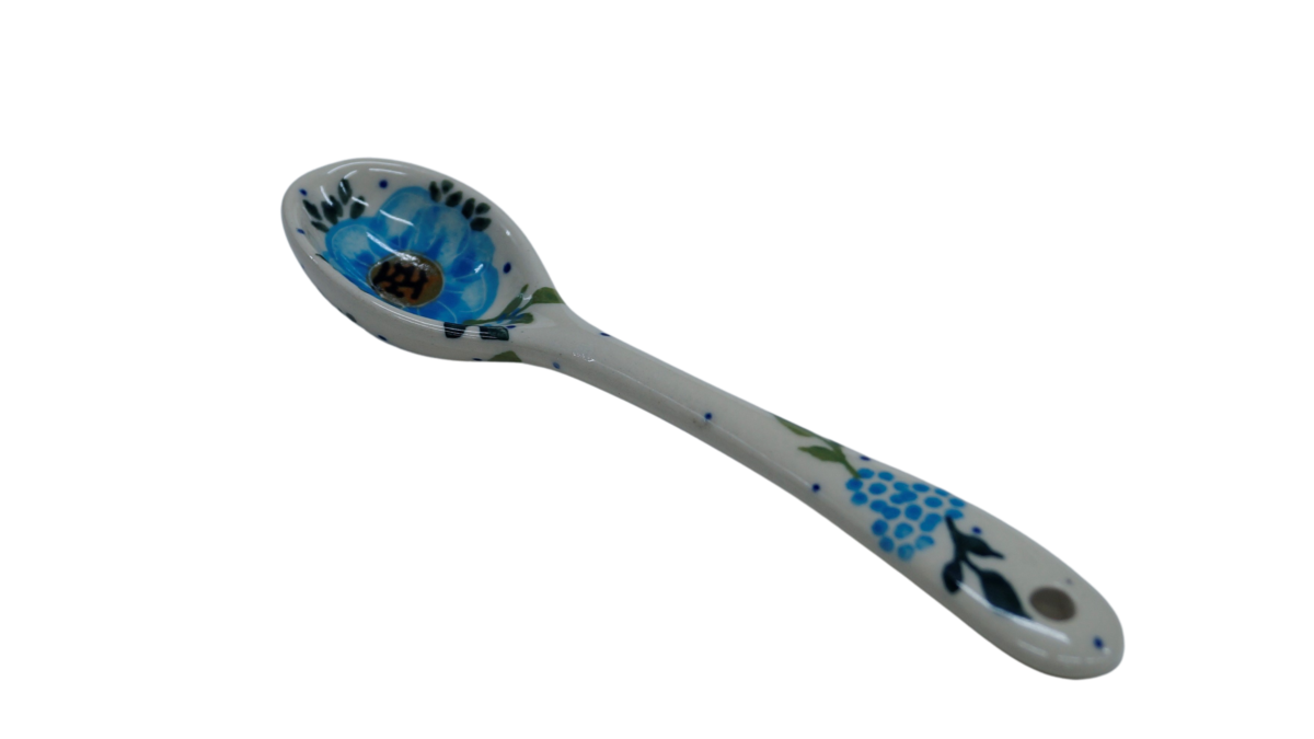 Łyżka ceramiczna deserowa mała, to jeden z podstawowych elementów wyposażenia kuchni, ręcznie malowana w unikatowe dekoracje kwiatowe i stempelkowe, wyprodukowana w bolesławieckiej manufakturze ceramiki artystycznej.