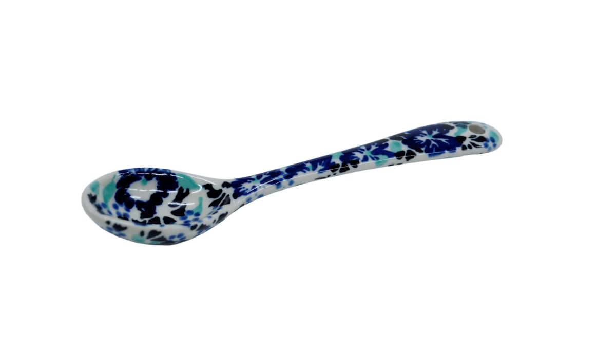 Łyżka ceramiczna deserowa mała, to jeden z podstawowych elementów wyposażenia kuchni, ręcznie malowana w unikatowe dekoracje kwiatowe i stempelkowe, wyprodukowana w bolesławieckiej manufakturze ceramiki artystycznej.