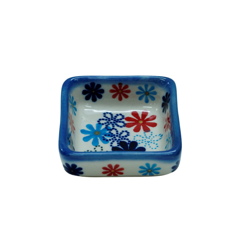 Oryginalny produkt ceramiki bolesławieckiej - miseczka kwadratowa na sos 1, o pojemności 35 ml, idealna do podawania i przechowywania wszelkich rodzajów sosów (sos czosnkowy, ziołowy, majonez czy ketchup).