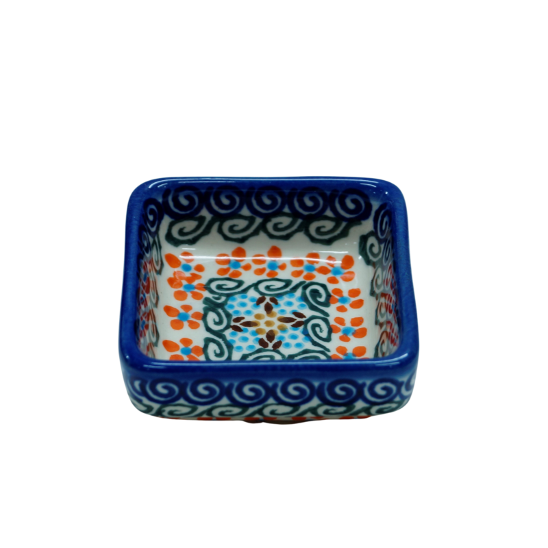 Oryginalny produkt ceramiki bolesławieckiej - miseczka kwadratowa na sos 1, o pojemności 35 ml, idealna do podawania i przechowywania wszelkich rodzajów sosów (sos czosnkowy, ziołowy, majonez czy ketchup).